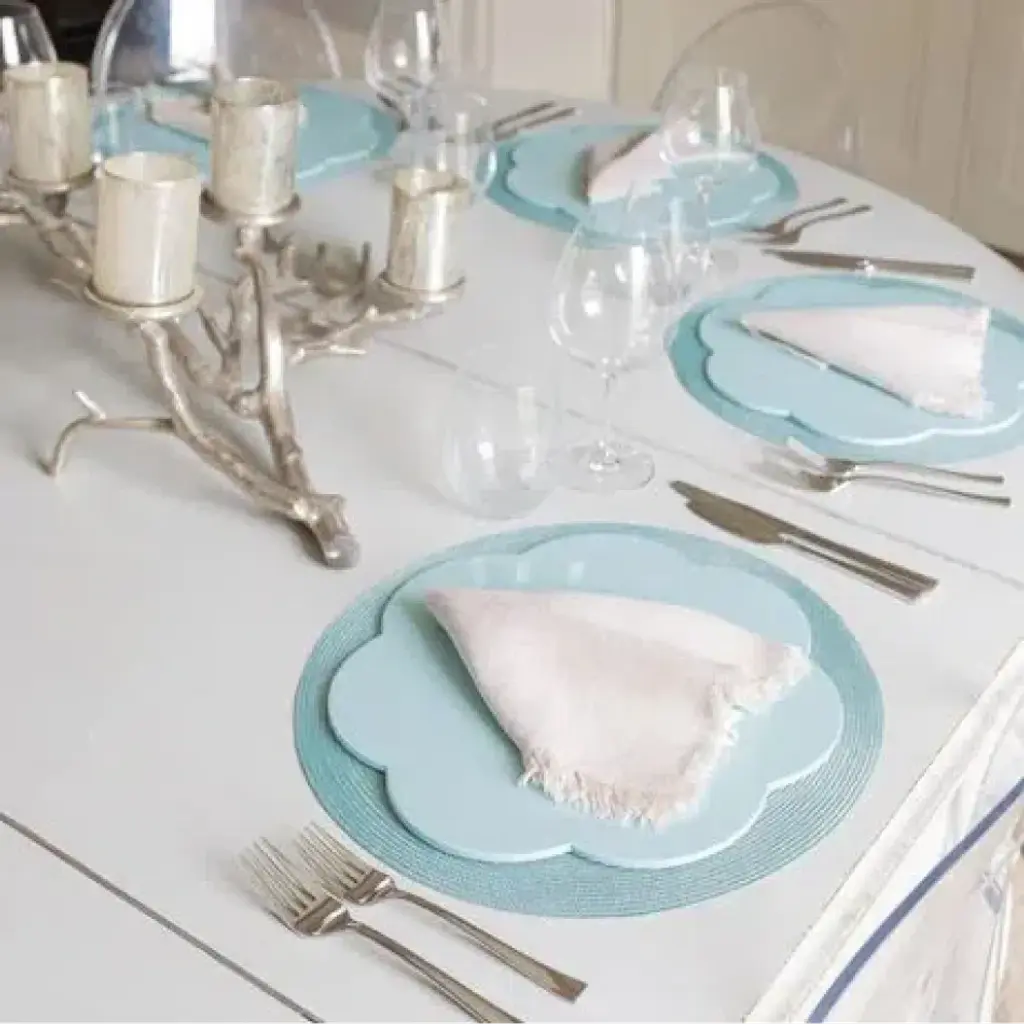 This set of 4 Eau De Nil Scalloped Placemats is finished with 20 coats of high gloss lacquer, hand polished between each coat. They will beautifully complement any dining room or kitchen.