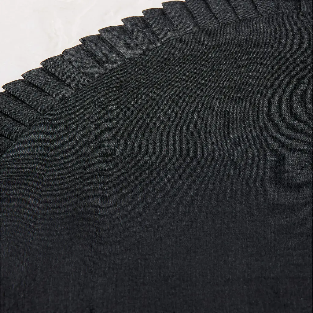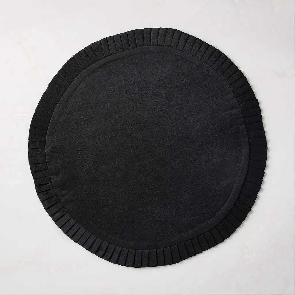 Ultra-saturated black sets the tone for this luxurious silk placemat by Chicago-based fashion designer Azeeza. Using the same silk as her garment collections, the playful ruffle detail is balanced by the neutral black color. "Simple colors, such as black, require a statement design to stand out," Azeeza explains. "The idea is to keep your environment from being dull by infusing it with life in a melodic way." CB2 exclusive.