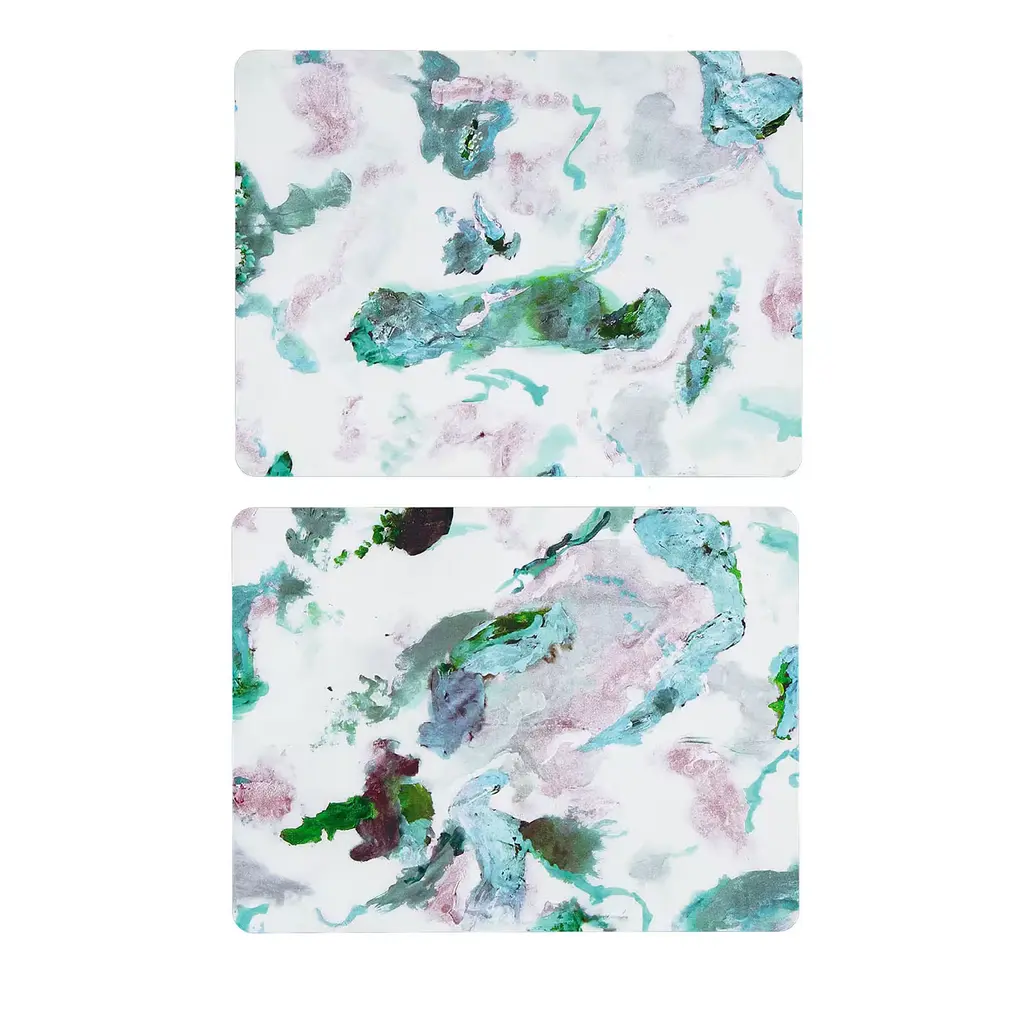 This sophisticated set of two polyester organza tablemats and coordinated linen napkins features an abstract motif handpainted by Luisa Longo directly to the table. A pleasant peach-peel feel enriches the stunning purple-and-green mottled pattern, offered in different cuts of the wide original motif. Resistant to abrasions, heat, and stains, the mats are also flexible and easy to wash.