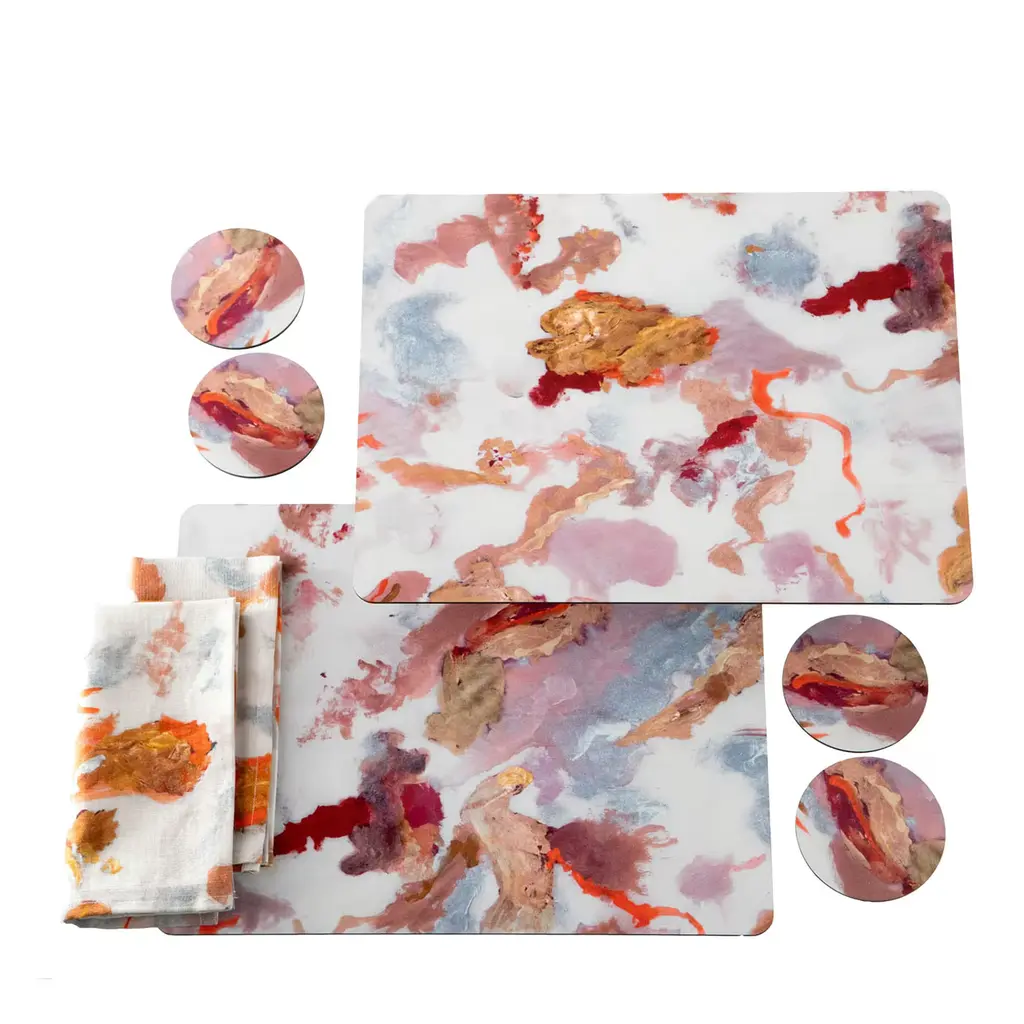 The original Luisa Longo artwork has been digitally transferred with the highest tridimensional effect on an extra shiny lacquered wood-fiber mat with slightly rounded edges. Every mat is different, cut from the same artwork creating a precious and artistic table setting. The back is in anti-slippery natural cork. Self-print 100% linen napkins are available on request and matching coasters. Printed wood fiber mat.