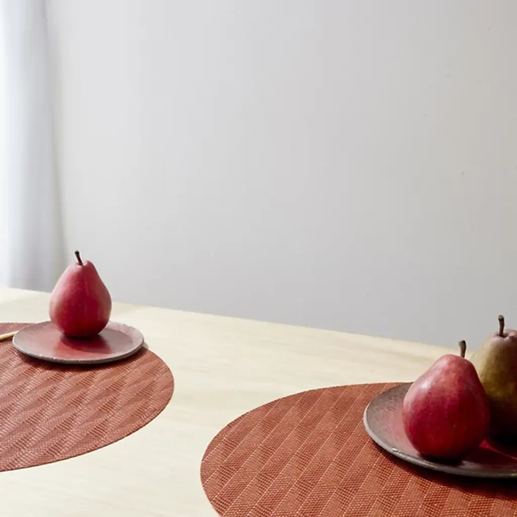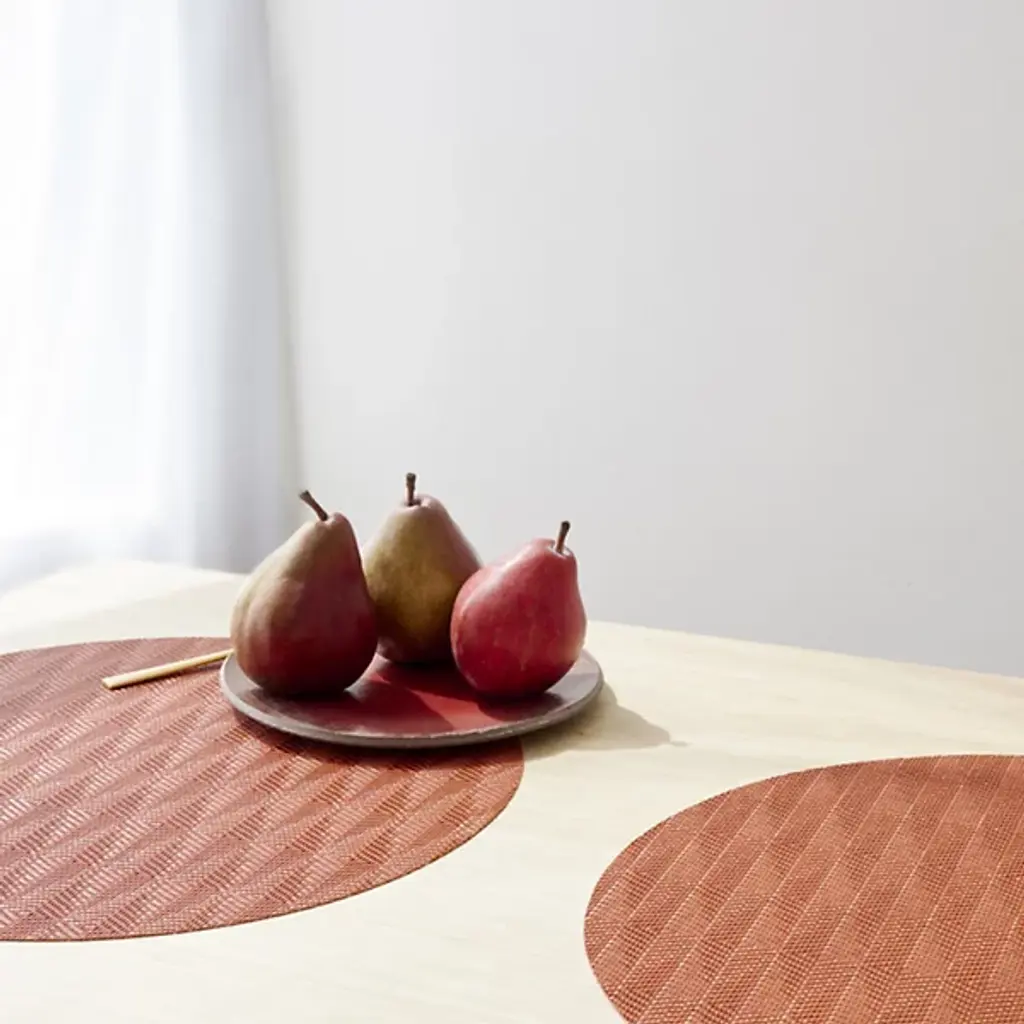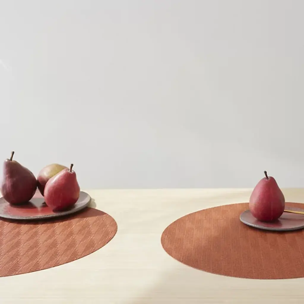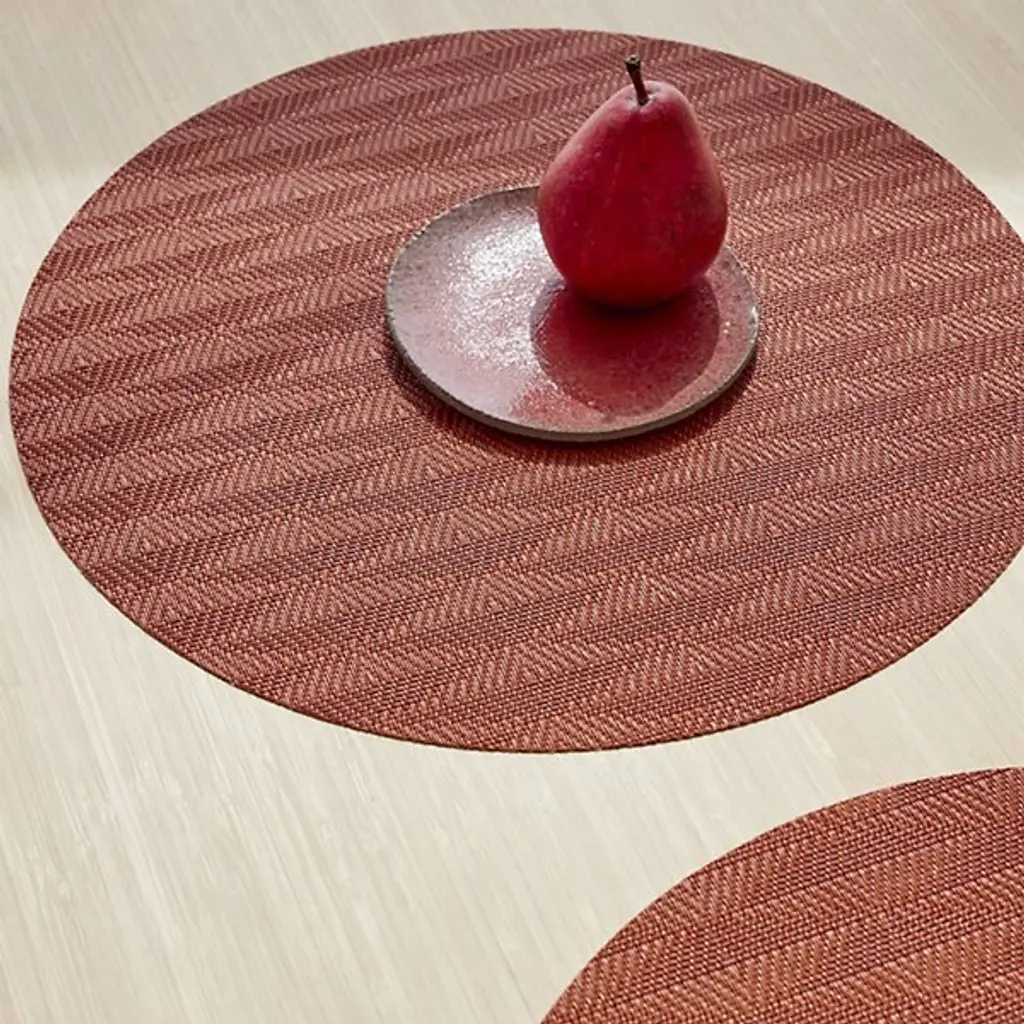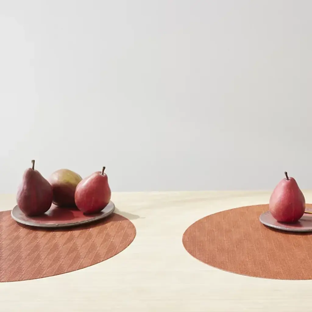 Made in the USA, the Arrow Round Placemat is presented by Chilewich. Crafted from signature Terrastrand woven vinyl, this placemat showcases exceptional craftsmanship and durability. The gently contrasting geometric pattern along the surface provides a pleasant focal point. Easily upgrade your dining space with this piece, as it effortlessly combines form and function.
