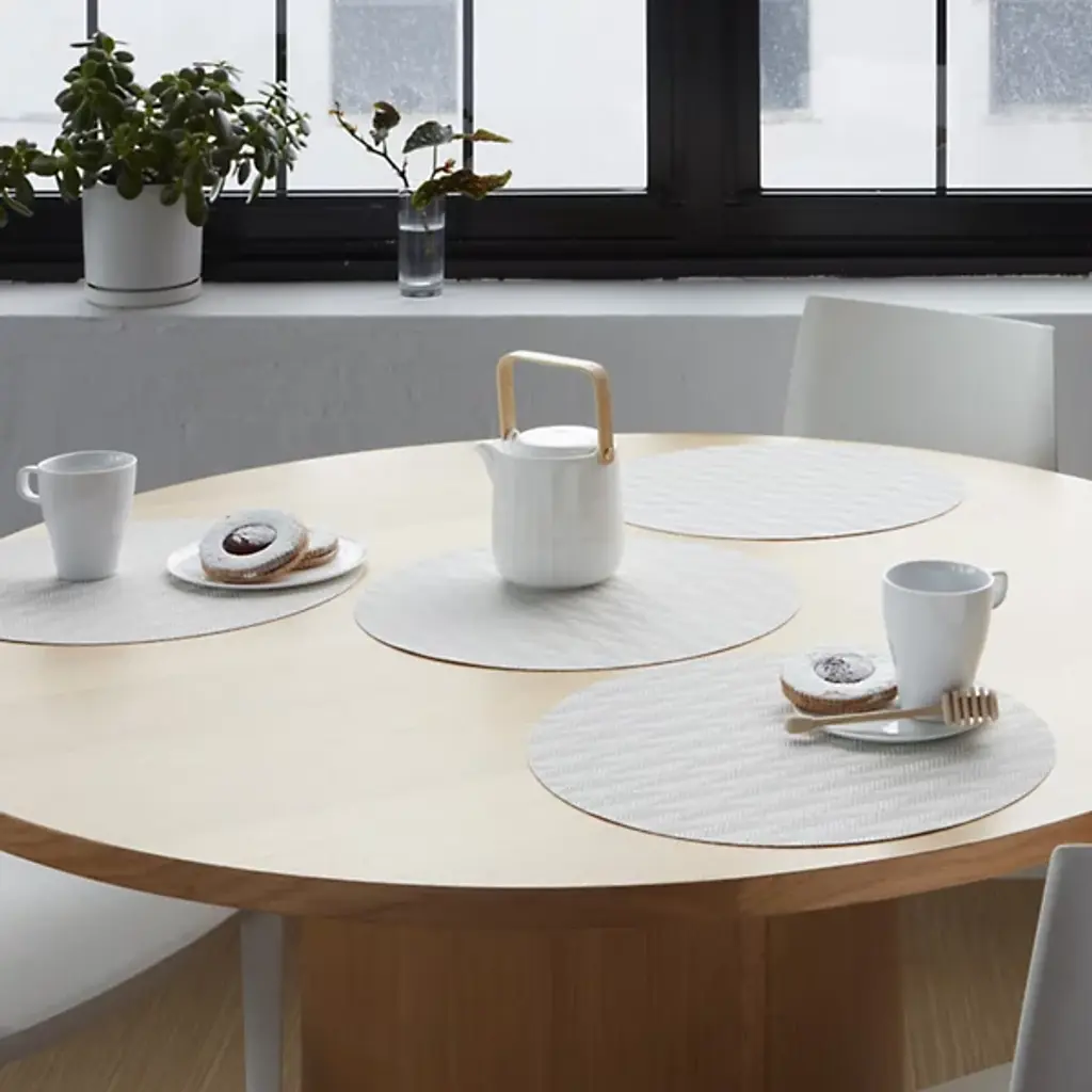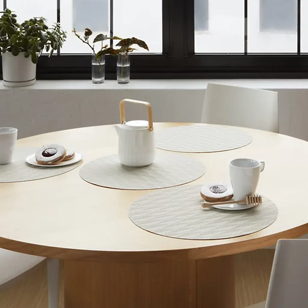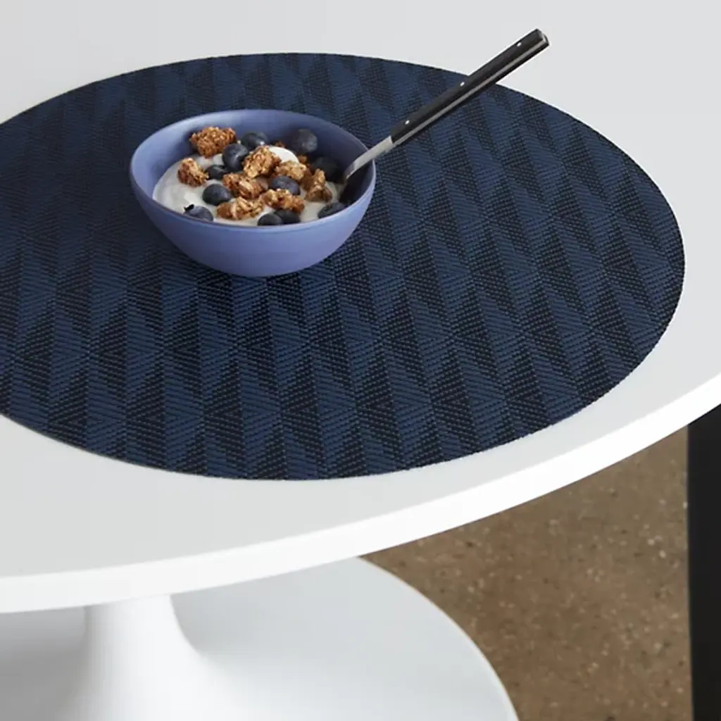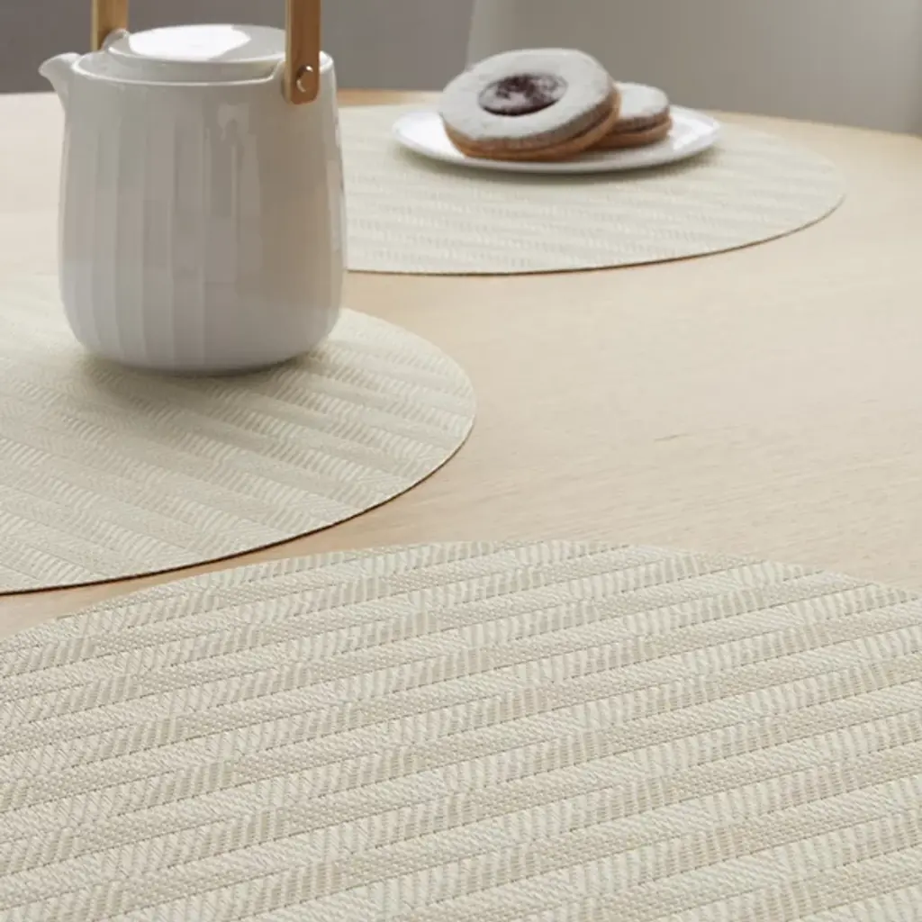 Made in the USA, the Arrow Round Placemat is presented by Chilewich. Crafted from signature Terrastrand woven vinyl, this placemat showcases exceptional craftsmanship and durability. The gently contrasting geometric pattern along the surface provides a pleasant focal point. Easily upgrade your dining space with this piece, as it effortlessly combines form and function.