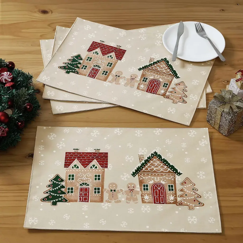 The Avanti Gingerbread Village Set of 4 Holiday Placemats features 2 houses with gingerbread people and Christmas trees in the center. The linen-colored ground is covered with white dots and snowflakes and framed with light brown borders on either side. Printed on 100% polyester for easy care, 13" x 19".