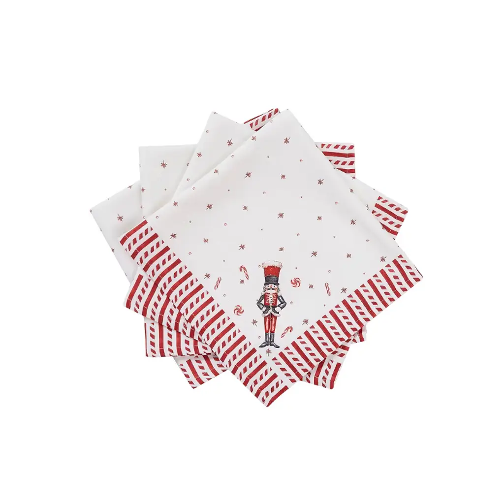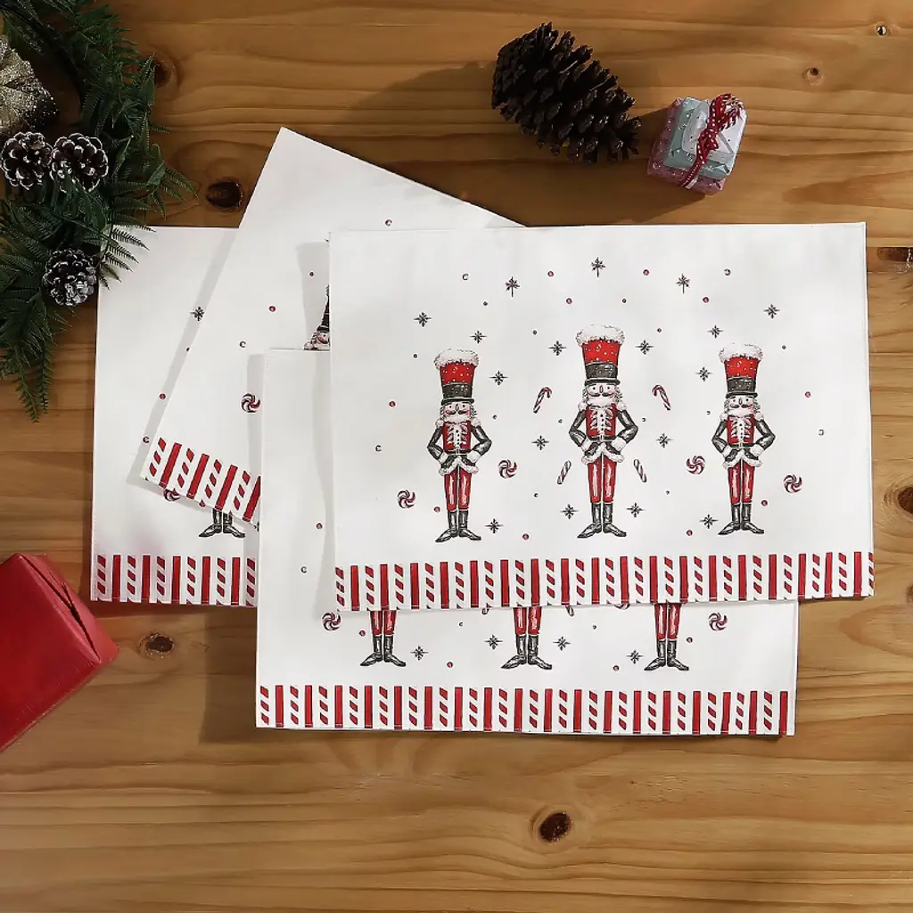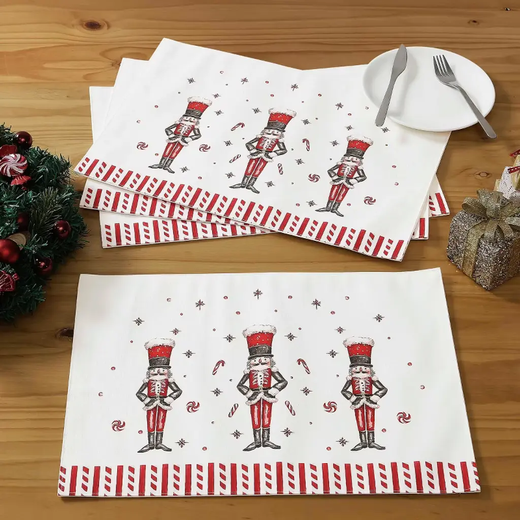 The Avanti Nutcracker Candy Set of 4 Holiday Placemats features a festive nutcracker standing guard in one corner with a candy cane border on all sides. Candies and red snowflakes are tossed throughout on a white ground. Printed on 100% polyester for easy care, 13" x 19".