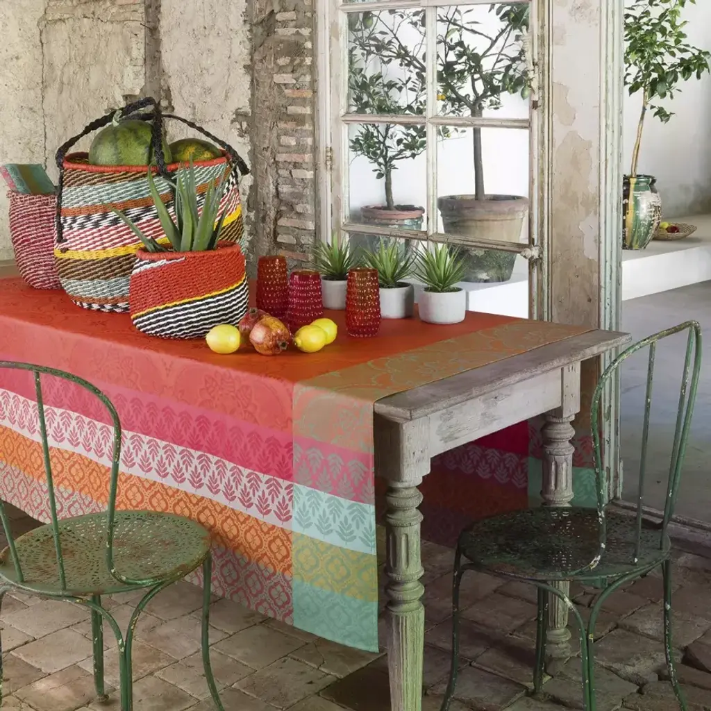 This design inspired by Indians evokes Provence, this deliciously sophisticated retreat full of charm. Since 1888, Le Jacquard Francais has created a collection of table linens without equal. Weavers, warp beamers, knotters and other specialists work in harmony to perfect the weaves and colors of all of their linens. Classic Le Jacquard Francais linens are characterized by using framed woven patterns to create timeless tablecloths, napkins, placemats and table runners that will beautify your tables for many years. Le Jacquard Francais coated tablecloths are made of 100% cotton weave with long fibers. They are waterproof and stain-resistant thanks to a patented and exclusive acrylic coating that withstands washing. Newly introduced, LJF by Le Jacquard Francais is a more casual line of contemporary looks that mixes colors and patterns and plays with graphics. Practical and easy to use, these tablecloths will stand up to frequent use in the kitchen or patio.