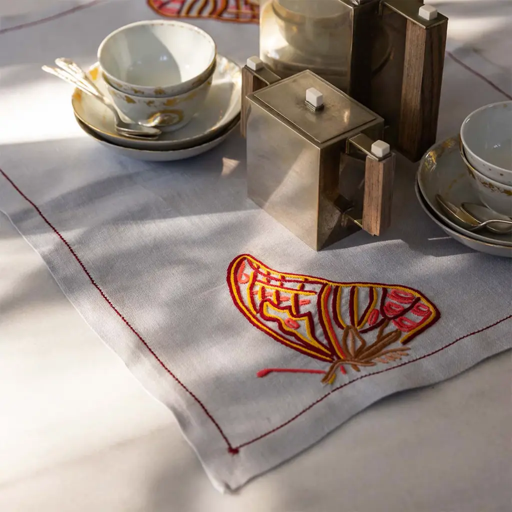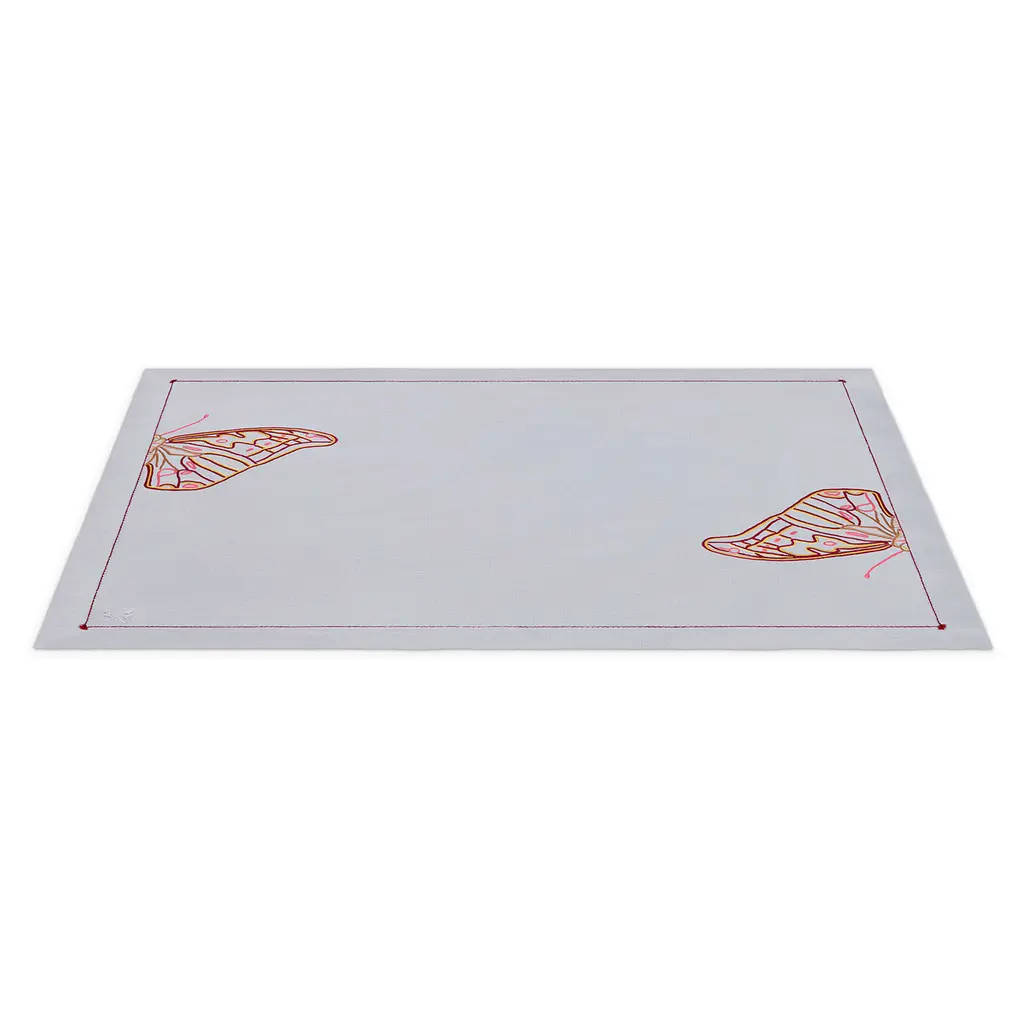 With the central motif on display, these colourful hand-embroidered placemats create a sophisticated and uniform table-scape, the perfect individual backdrop to any meal. With each motif taking fourteen hours to complete, and each meter of open hem two hours to prepare, the artistry behind each design is significant. Pair with contrasting coloured crockery for a bolder design statement.The magnificent forms and colours of butterflies have inspired artists for generations, with this collection reigniting our appreciation for their natural beauty. Through delicate needlework and soft hues, the magic of these dazzling creatures brings any table to life.