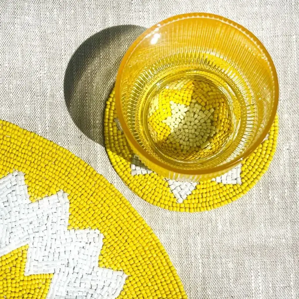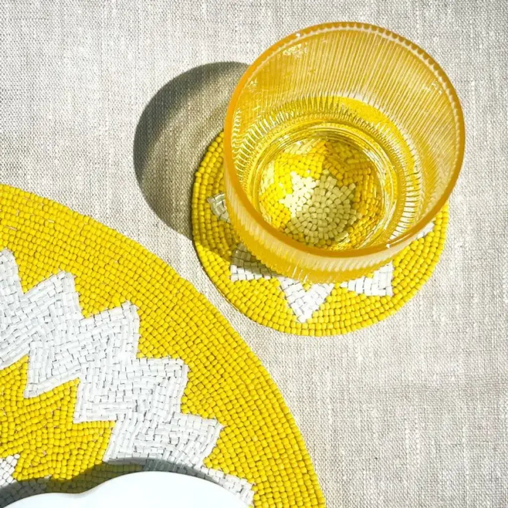 Vibrant and lively, these colorful hand-beaded placemats will transport you to the shorelines of Italy. Available in two colorways, the vivid hues inspire a sense of exotic lightheartedness. The blue & white colorway is reminiscent of the Mediterranean waters while the yellow & white variation resembles the sun glimmering over the coast of Naples. These dynamic, festive, and chic placemats will instantly brighten up a table. Pair with the coordinating Capri Coasters.