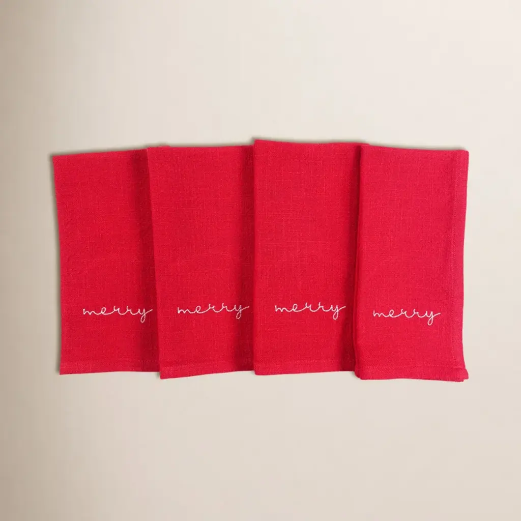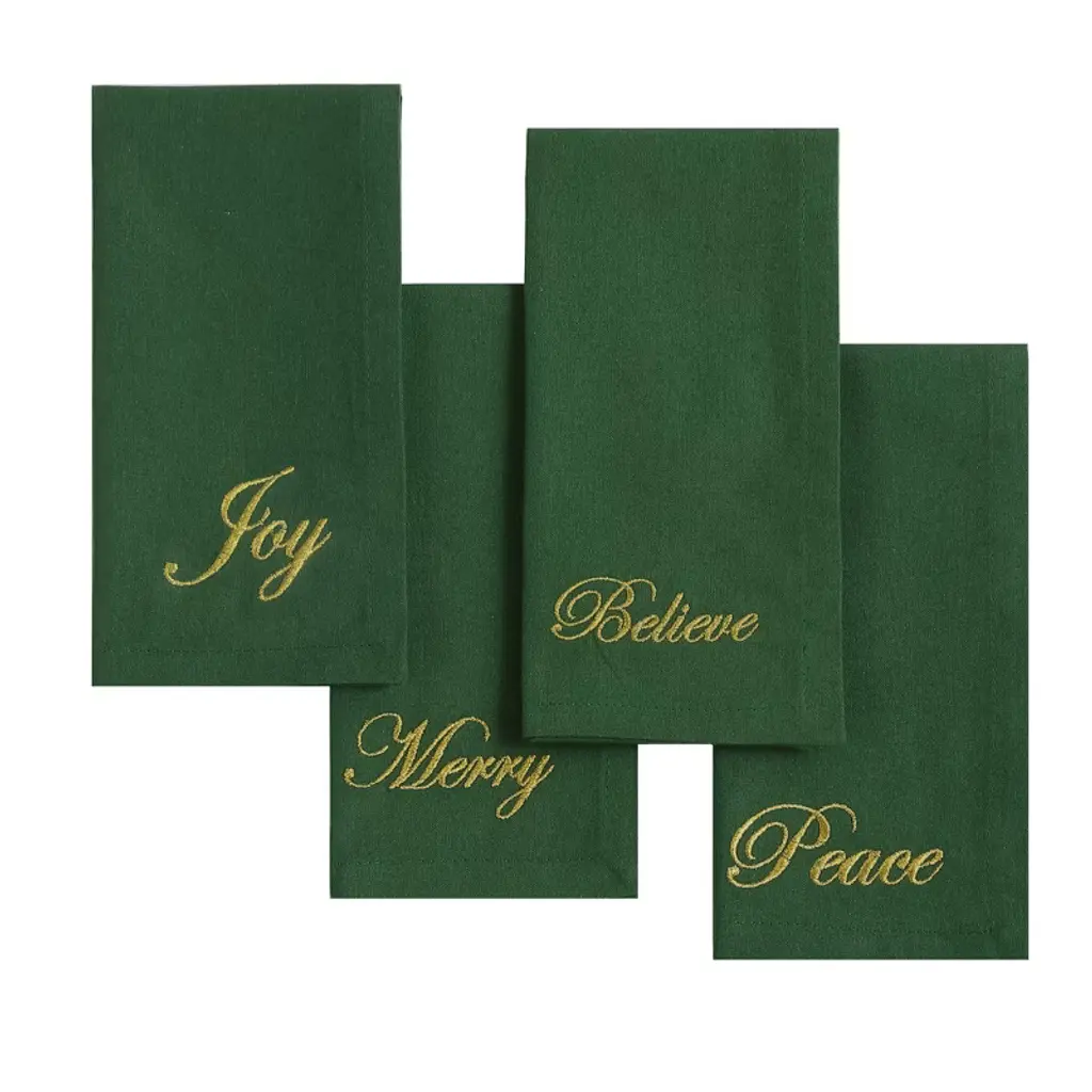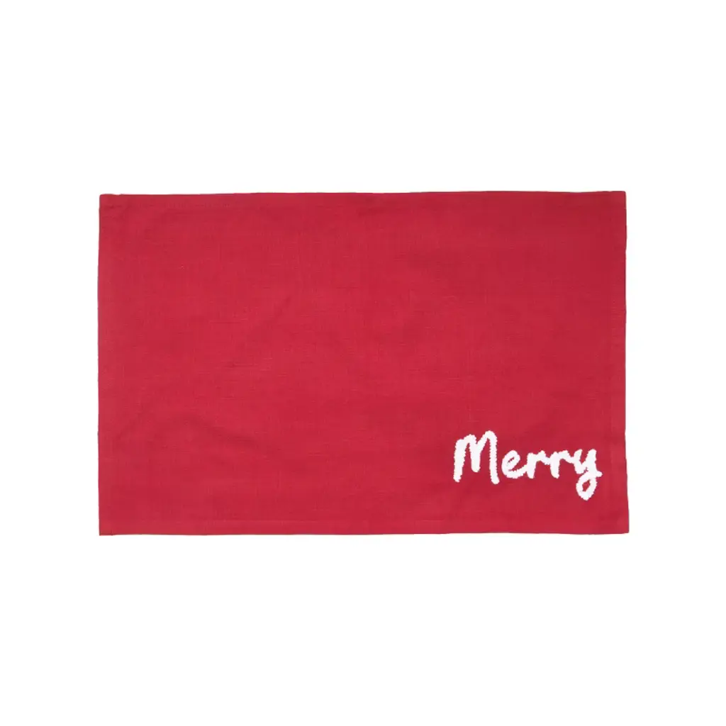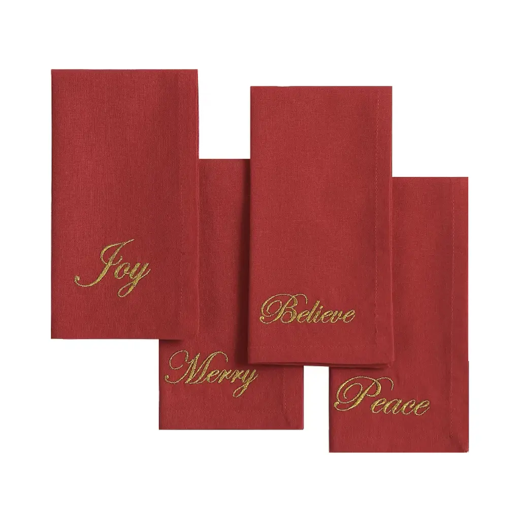 Tabletops get a festive makeover with carol & frank s cheerful holiday linens. The simplicity and minimalist of the solid woven cotton placemats, runners, and napkins feature joyful holiday sayings hand-embroidered in chunky yarn text atop solid cotton slub backgrounds. These casual table linens are ideal for holiday gatherings throughout the season.