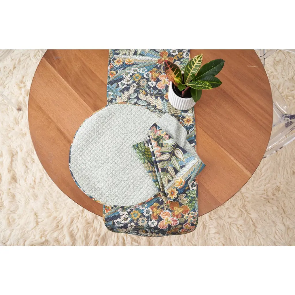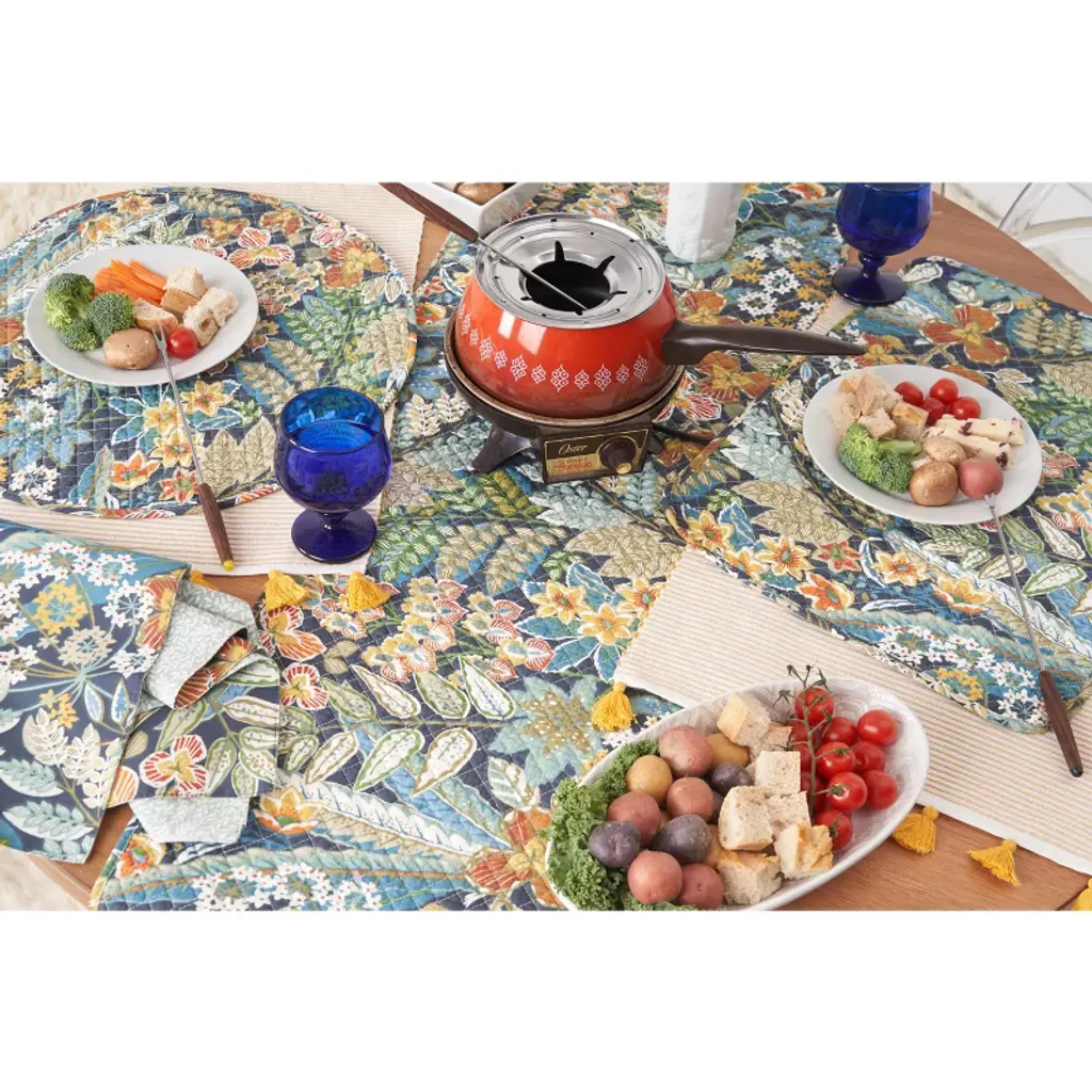 Posy table linens feature a charming array of artistically depicted flowers set against a rich indigo backdrop, evoking a picturesque meadow. Radiant dandelion yellow, modern melon orange, and lush succulent green harmonize with the complementary hues in this print to imbue a timeless allure, perfect for year-round tabletop decoration. Flip it over to reveal a soothing soft green ditsy botanical print, offering even more styling possibilities.