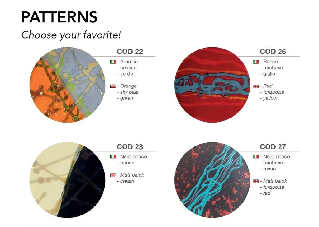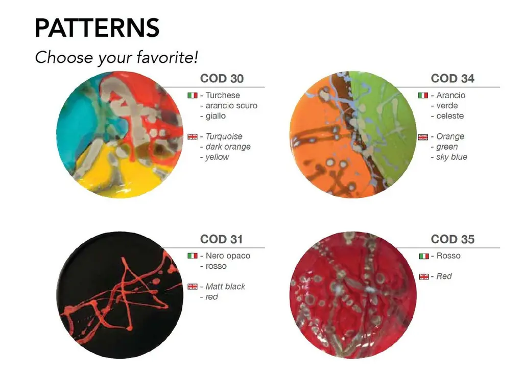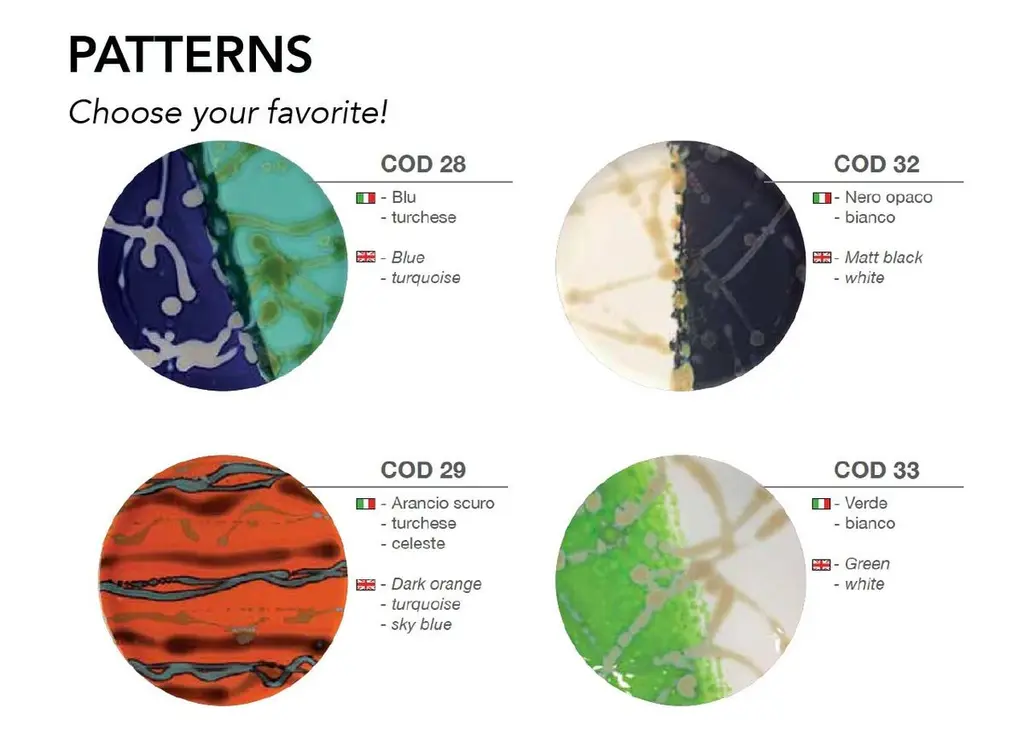 For more than 30 years this artist has revolutionized the way of thinking about stone. Their artisan techniques are the result of careful research and deep knowledge of the subject: they involve the meticulous artistic work of those who know how to see beyond, transforming the unexpected into a formula of uniqueness. The eclectic and resistant combinations in lava and volcanic stone are the effect of processes that change the shape of the material through the idea, fixed and tempered in an oven that forges its identity. Measure: L=30 cm.The incredible characteristics of volcanic stone and lava rock make them perfect materials for projects with high customization capacity: beautiful even in its natural form, the stone is coated with different glazes and hand-painted decorations for unique pieces of every color, size and shape. With its extraordinary resistance, the table tops can live both indoors and outdoors.Volcanic stone (mined underground) is used for the Classic tops (SUN), while Lava Rock (above ground) is used for the Design tops (COD). Lava rock is denser and harder than volcanic stone and it also bakes dark charcoal and does not require a white glaze base coat prior to adding the ceramic glaze. This allows the artist much greater flexibility and freedom as the organic color of the rock does not influence the designs.The term Majolica lava stone commonly indicates a lava basalt object that has a majolica surface decoration. In reality, since ceramics rather means a large grouping of terracotta artifacts, this decorative technique in the specialist field is more correctly referred to as Majolica lava stone or Majolica on lava stone. Thanks to the particular aesthetic potential due to ceramics, combined with the remarkable mechanical and physical resistance of basalt, ceramic-coated lava stone is used for the production of tables, tops for kitchens and bathrooms, floors, mosaics, shower trays, sinks and coverings.The process of working stone and volcanic lava is divided into several phases, all carried out by hand in the studio: cutting, glazing, hand decoration, vitrification and double firing at over 1000 degrees. All this makes the material suitable for any indoor and outdoor environment, as it does not undergo any variation if exposed to snow, rain, sunlight or salt. Furthermore, it has excellent characteristics of impact resistance, does not absorb any type of substance, does not stain, does not alter in contact with heat sources such as embers, hot pots or acid solutions and has a degree of resistance to scratching higher than marble.The artist's workmanship is an expression of the great technical and custom ability of its craftsmen, who elaborate complex shapes and combinations to create objects with a strong, fluid and harmonious identity like the hand of nature. The ability to investigate the stone and its facets allows you to work objects whose appearance you can only imagine: present and future alternate in the eyes of the craftsman, until the moment of firing, which consecrates the piece in its indestructible final form.