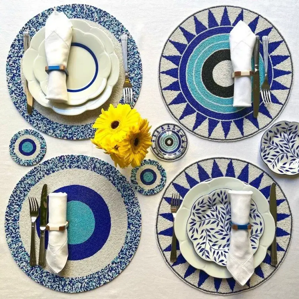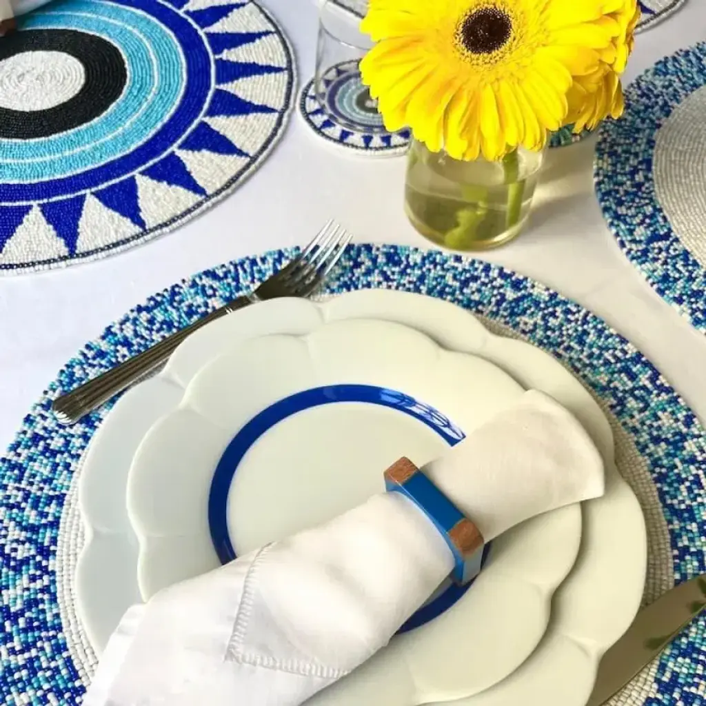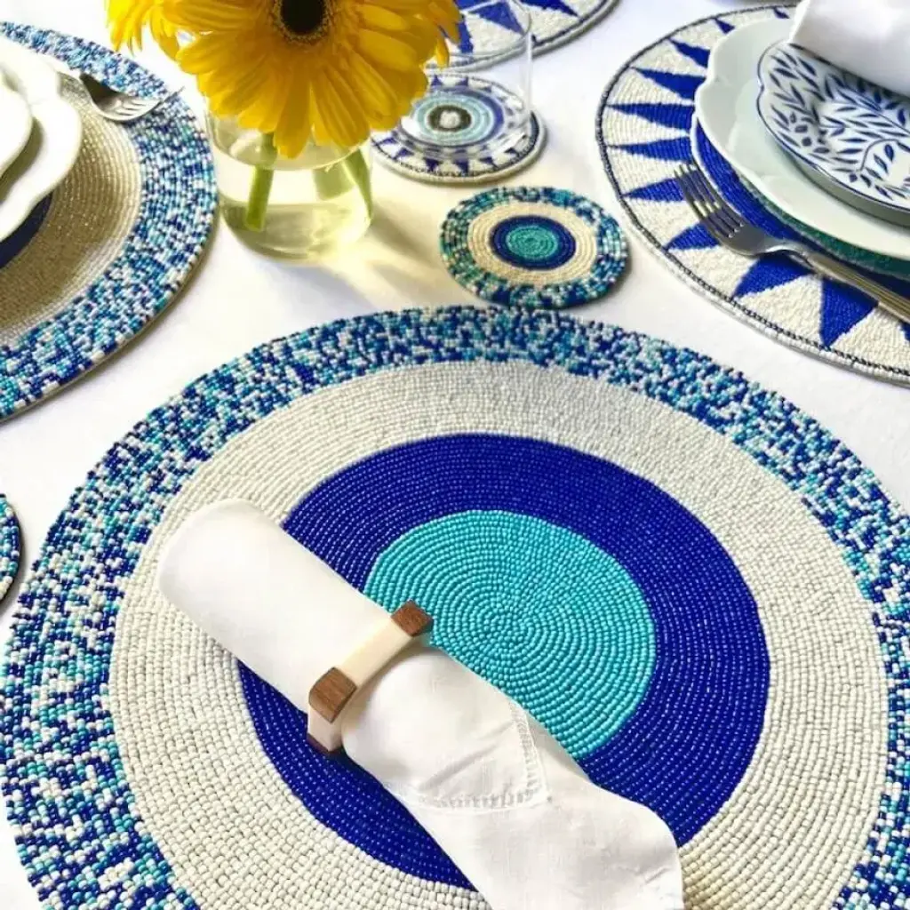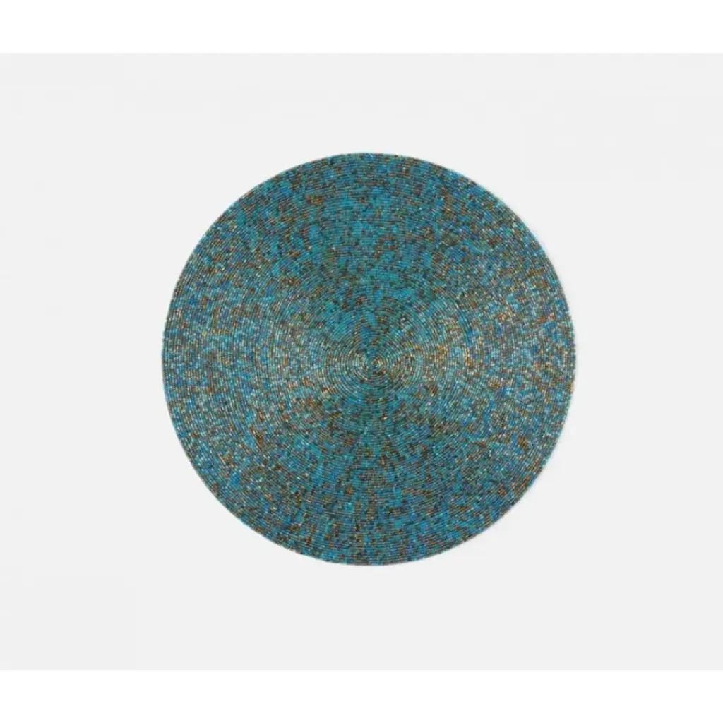 Petite glass beads are interlaced to create a richly dynamic design. The Charm Placemats display a popping pattern of geometric circles in brilliant light and dark blues. Pair with the coordinating Charm Coasters.