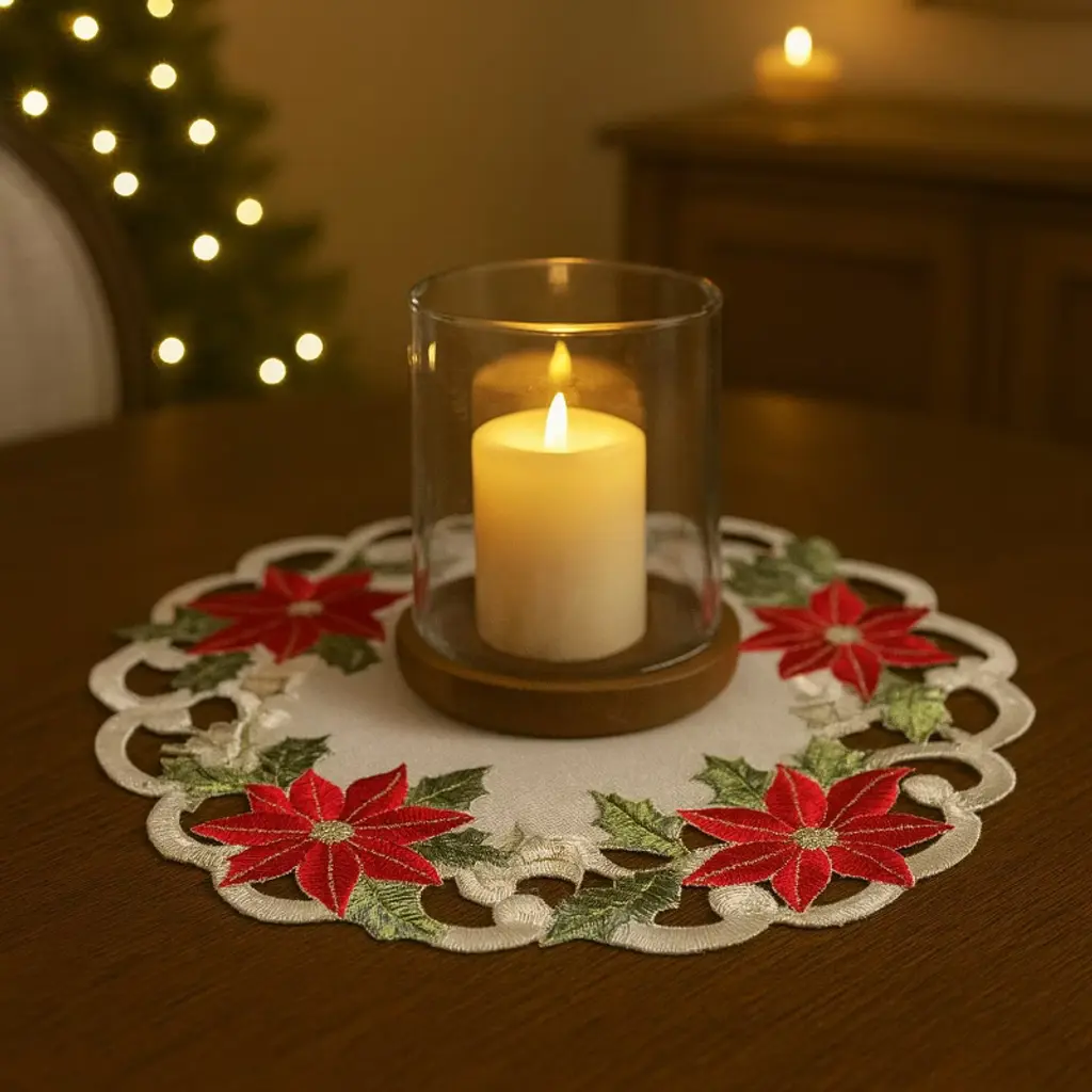 Christmas Poinsettia Embroidered Cutwork Round Placemat, 23-inch Diameter