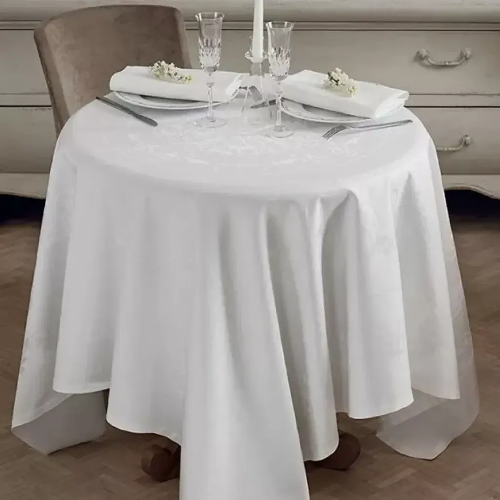 Comtesse is a very classic and luxurious design inspired by the magic of French gardens. It is made with Green Sweet stain resistant technology for easy care, except napkins. High thread count gives more details in the design and luxurious feel of the fabric. Finished with mitered corners. Style: Damask. Garnier-Thiebaut's damask cotton fabrics are made in France, using 100% two-ply twisted cotton, mercerized for long life and durability of the product. The designs are created by our team of designers to follow the home fashion trends. Some designs are also available in custom sizes. Coated Cotton: Made in France, the fabulous damask fabrics used for our coated table linen are made with 100% two-ply twisted cotton, coated with three layers of acrylic on top for best quality, long life and easy care of the table linen. Custom sizes are available as well. Green Sweet: Made in France, this fine damask fabric is made with our unique Green Sweet stain-resistant technology to protect the cotton from most stains and make your life happier. We use 100% two-ply twisted cotton for best quality and long life of the table linen. Since 1870, Garnier-Thiebaut has created classic and jacquard linens in the quintessential French style. Their linens have been used by the Four Seasons George V in Paris, the Mandarin Oriental Hotel in Geneva, The Ritz Carlton, Manama (Bahrain), Le Meridien Bora Bora, the Four Seasons Hotel, New York, and The French Laundry in Yountville.