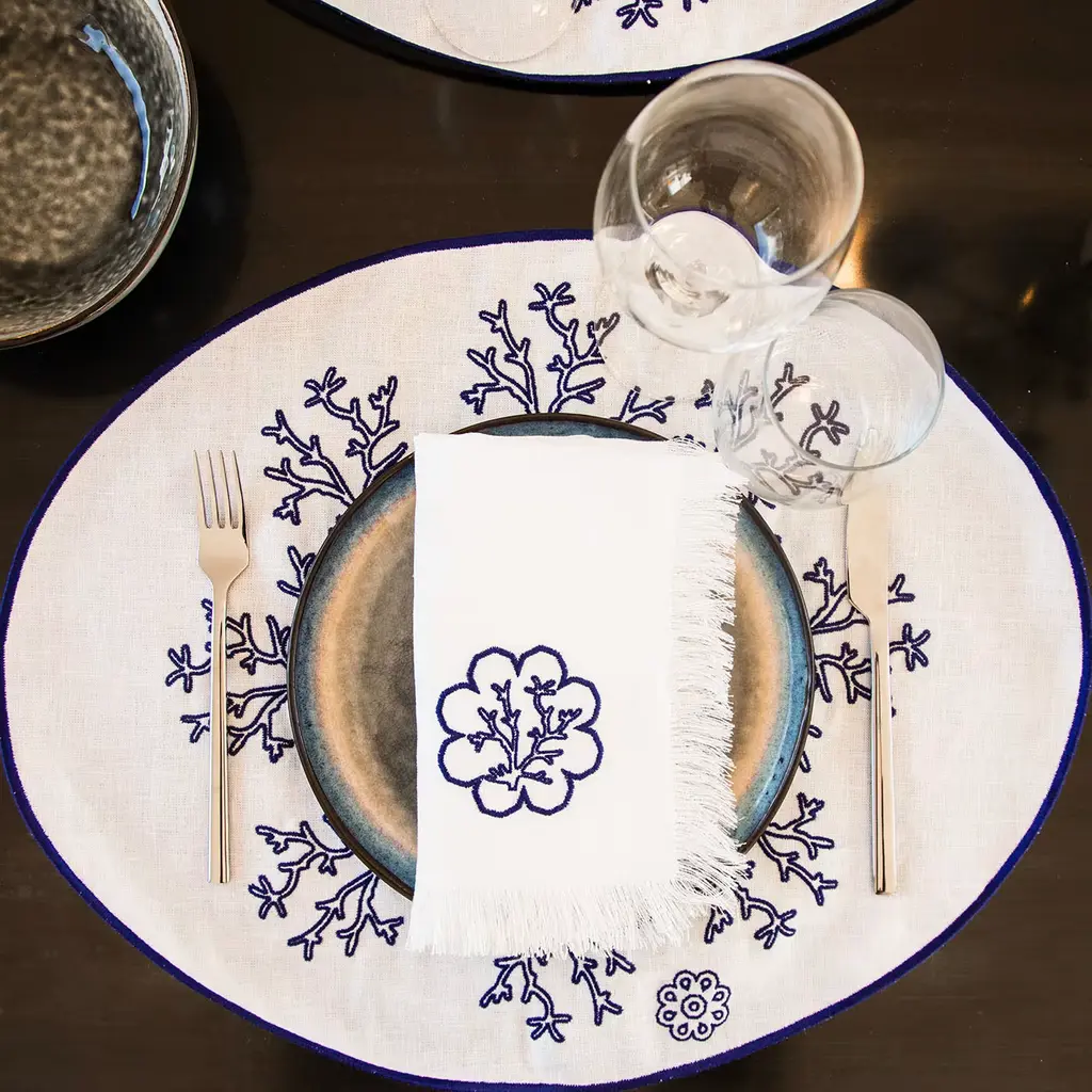Splendid solution for setting elegant sea-inspired tables, this set of two oval table mats in white Masters of Linen-certified linen flaunts singular embroideries of corals. Marked by a vibrant color scheme and evocative coastal atmospheres, the set requires multiple hours for the manual embroidery in fine blue Mako cotton to be completed and perfected. A red variant is available.