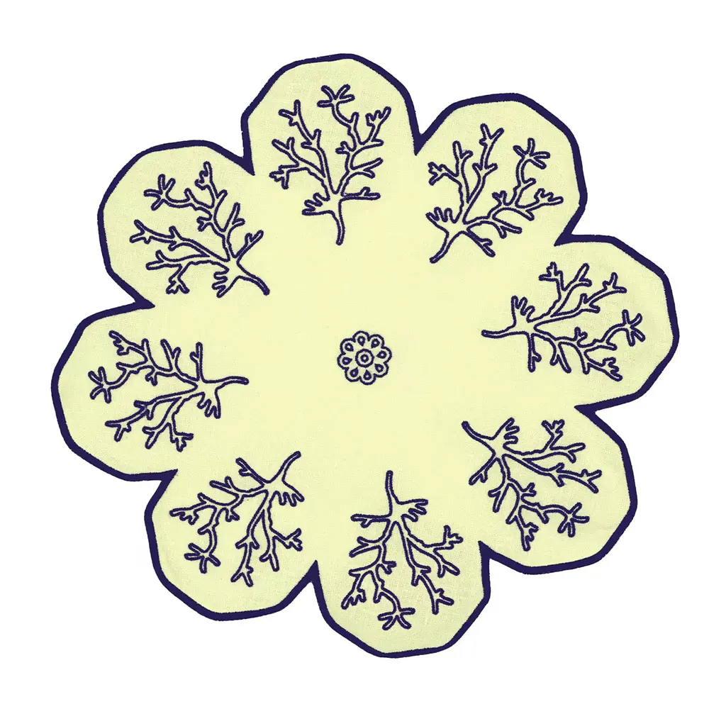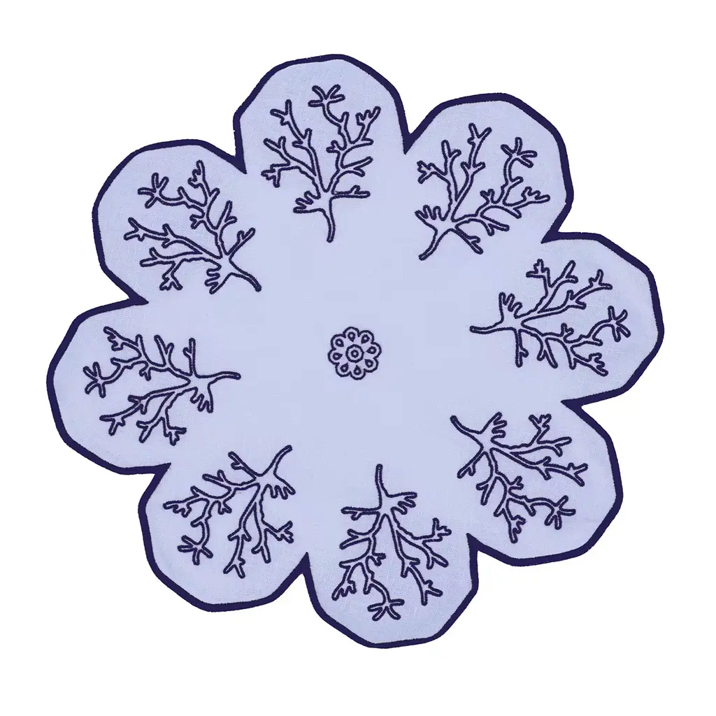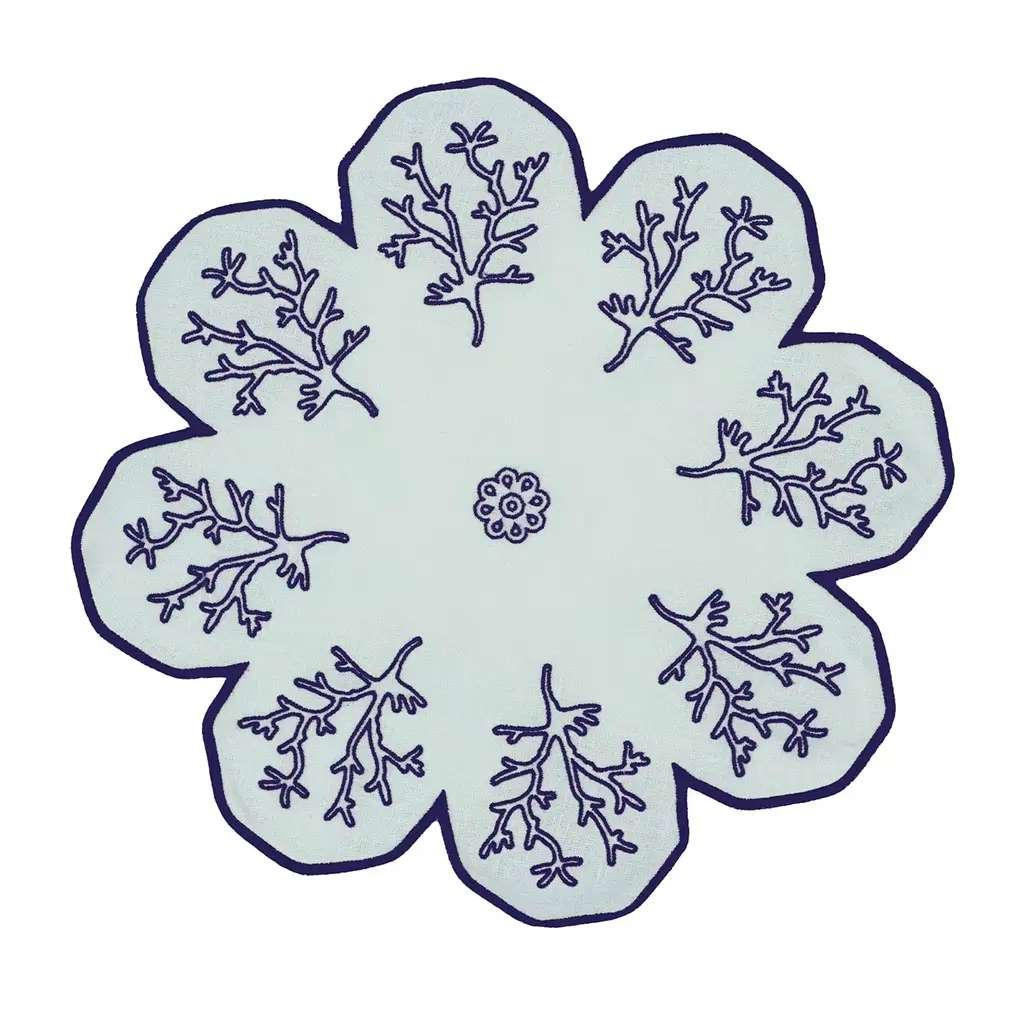 A fresh tone of azure was selected for this shaped service placemat in Masters of Linen-certified linen, its marine inspiration is clearly stated by minute coral embroideries. Crafted by hand using only fine pink Mako cotton, the embroideries not only match the placemat's floral-like profile but also attest to the mastery of the artisans behind them. More color options are available.
