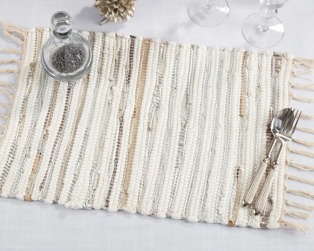 Placemats add a nice touch to any table. They provide the basis for a lovely layout. Regardless of your design style, you can't deny these raving beauties. They're appealing without even trying. They're where well-cultured taste meets simplicity. These oblong-shaped, foil-strip Chindi placemats are made from a cotton-leather blend and they're pure knockouts. The best part about them is the foil accent, which makes them so attractive.