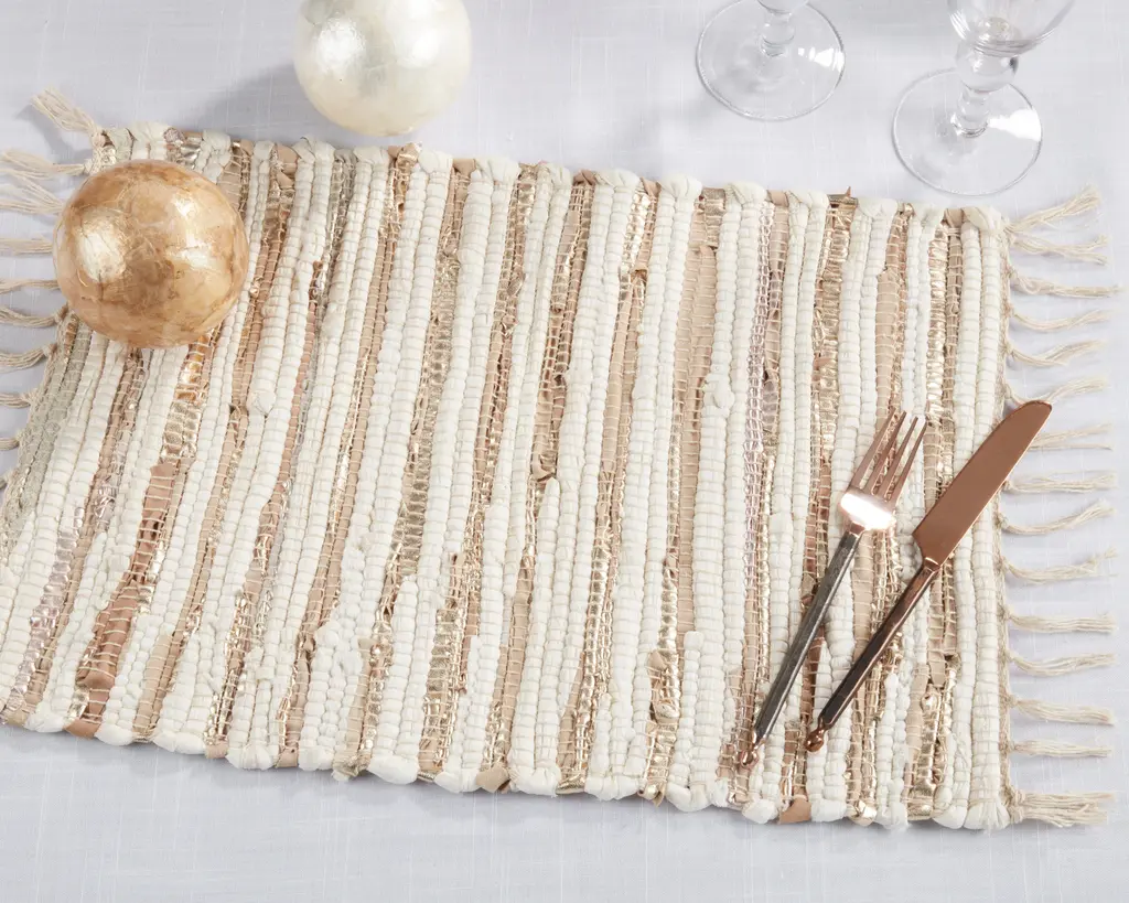 Placemats add a nice touch to any table. They provide the basis for a lovely layout. Regardless of your design style, you can't deny these raving beauties. They're appealing without even trying. They're where well-cultured taste meets simplicity. These oblong-shaped, foil-strip Chindi placemats are made from a cotton-leather blend and they're pure knockouts. The best part about them is the foil accent, which makes them so attractive.