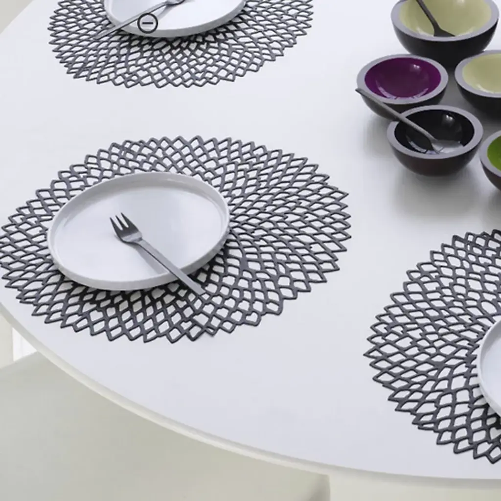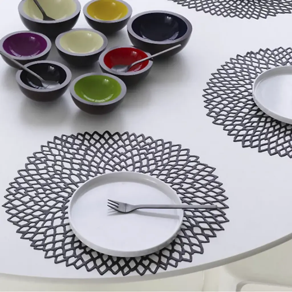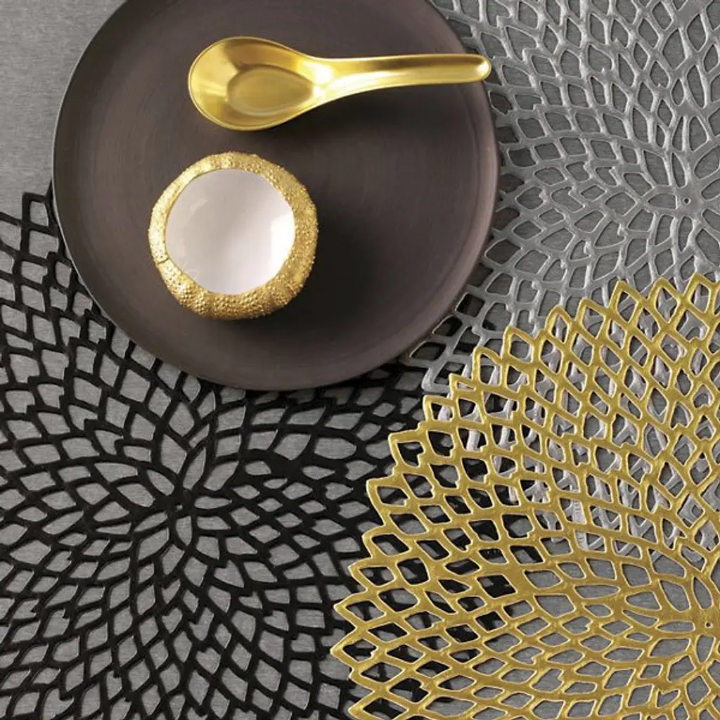 Add intricate, floral detail to the tabletop with the Chilewich Dahlia Placemat. Inspired by the dense configuration of petals seen in the most spectacular species of dahlia, the radial pattern of the Dahlia Set is made possible through the vinyl pressing process, which maintains strength despite the design's delicate appearance.