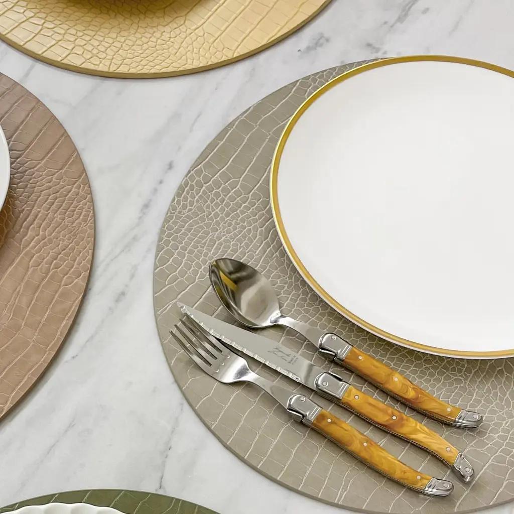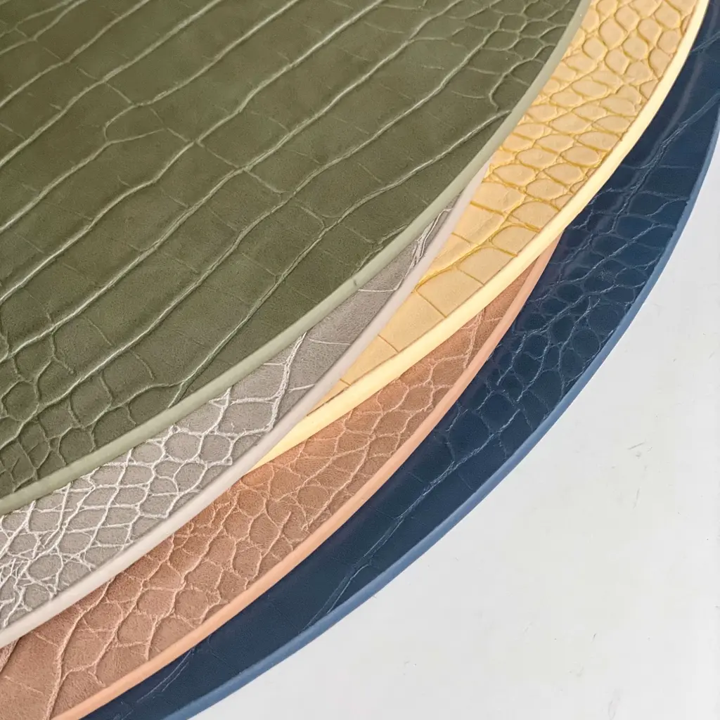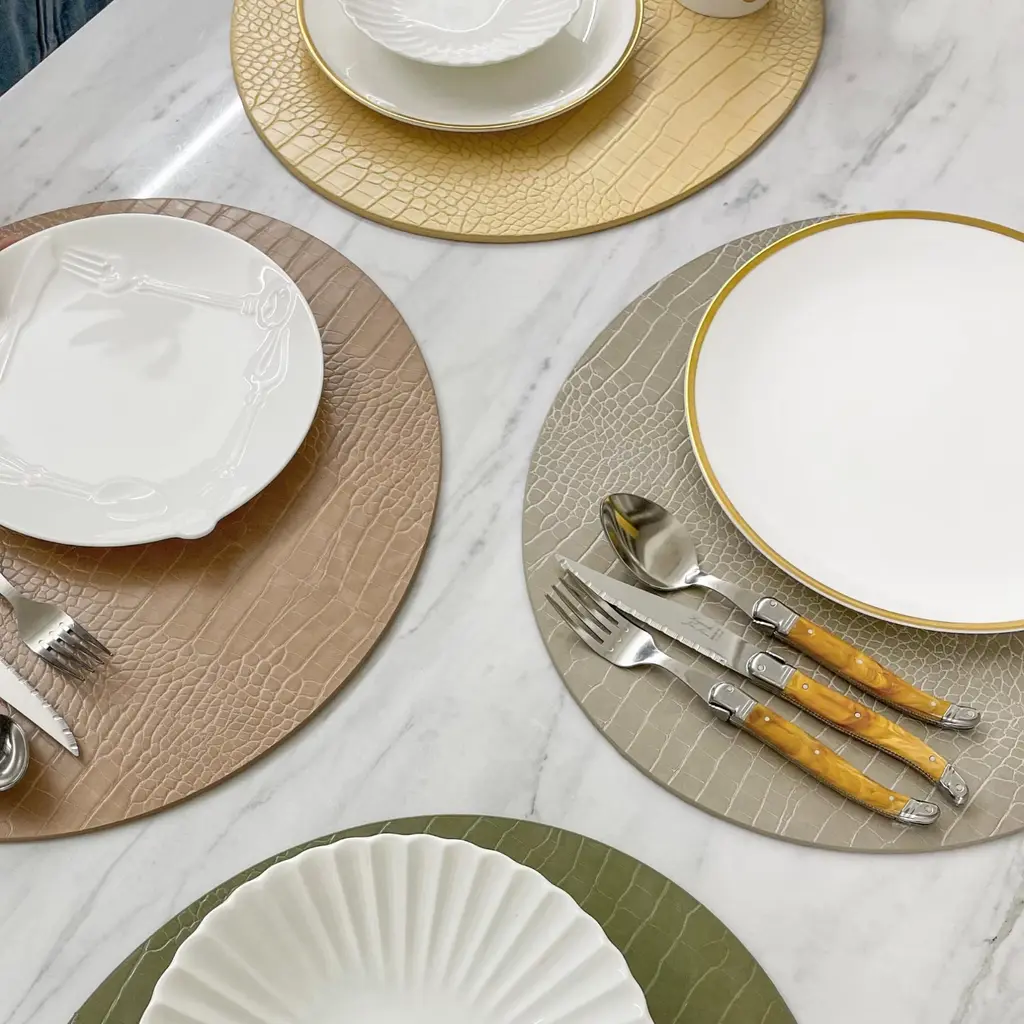Ideal for place setting. There are two mats per package and can be used on both sidesMaterial is animal-free artificial leather.