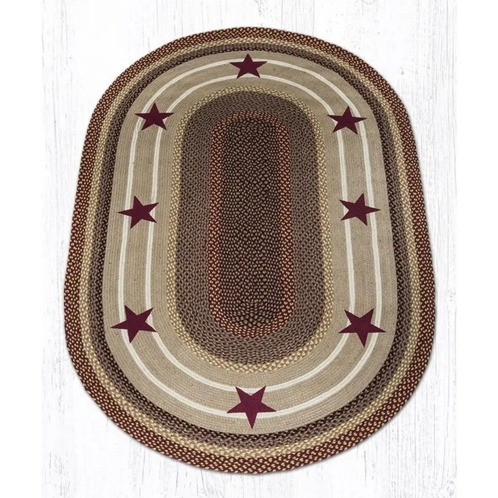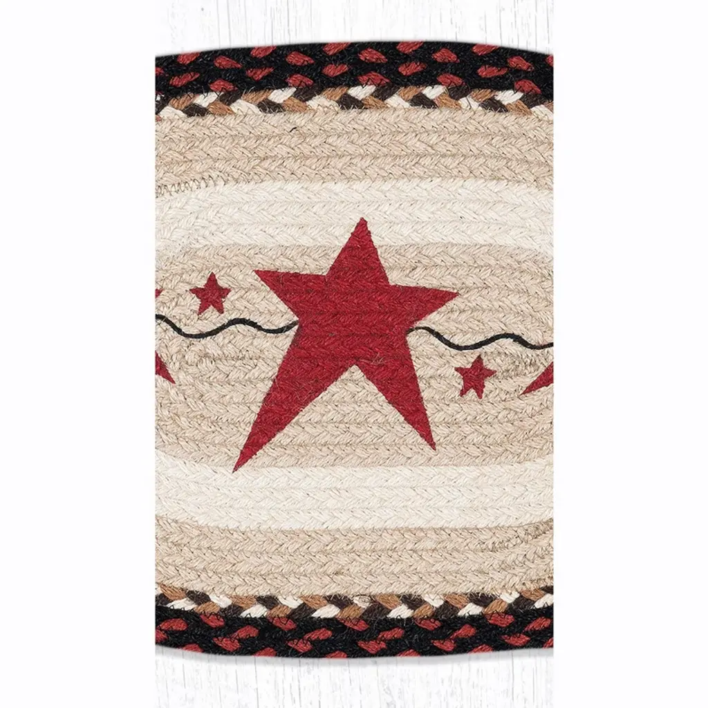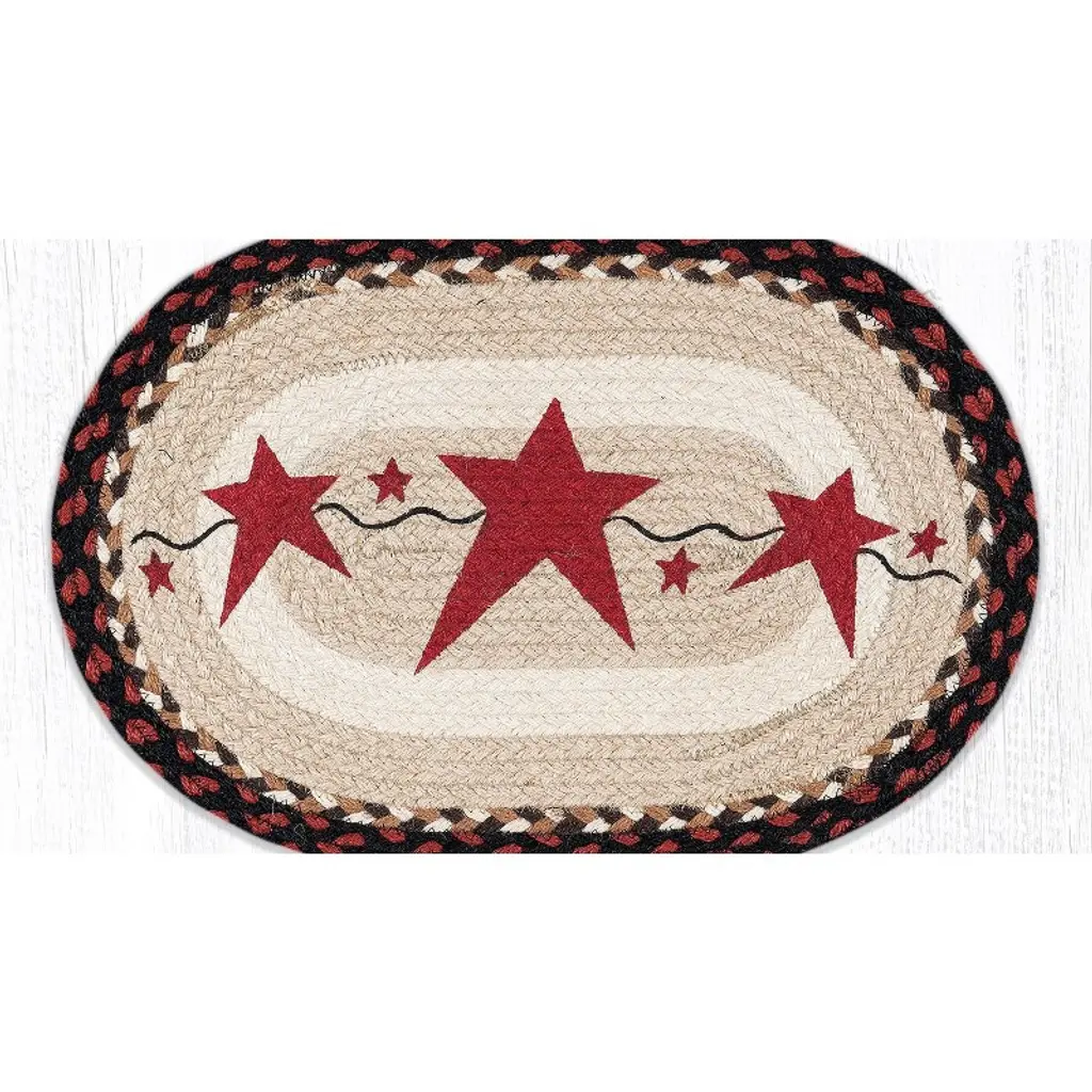 Earth Rugs Primitive Star Burgundy Oval Placemat 13"x19" Rustic Farmhouse Jute Table Decor Bring timeless rustic charm to your dining table with the Earth Rugs Primitive Star Burgundy Oval Placemat. Crafted from 100% natural jute fibers, this 13"x19" oval placemat showcases a rich burgundy background accented with a bold primitive star, perfect for farmhouse, lodge, or country-style decor. Key Features: Rustic Primitive Design – Features a bold burgundy background with a classic primitive star motif, perfect for farmhouse, lodge, or country-themed decor. Eco-Friendly Material – Made from 100% natural braided jute, sustainable and biodegradable. Durable & Protective – Helps protect your table from scratches, heat, and spills while adding a decorative touch. Handcrafted Quality – Each placemat is artisan-made with attention to detail for a unique, rustic look. Versatile Use – Ideal for everyday dining, seasonal gatherings, holiday tables, or rustic kitchen decor. Easy to Maintain – Spot clean with mild soap and water to keep its vibrant look. Perfect Size – Measuring 13"x19", the oval shape fits most dinnerware and complements rustic table settings.