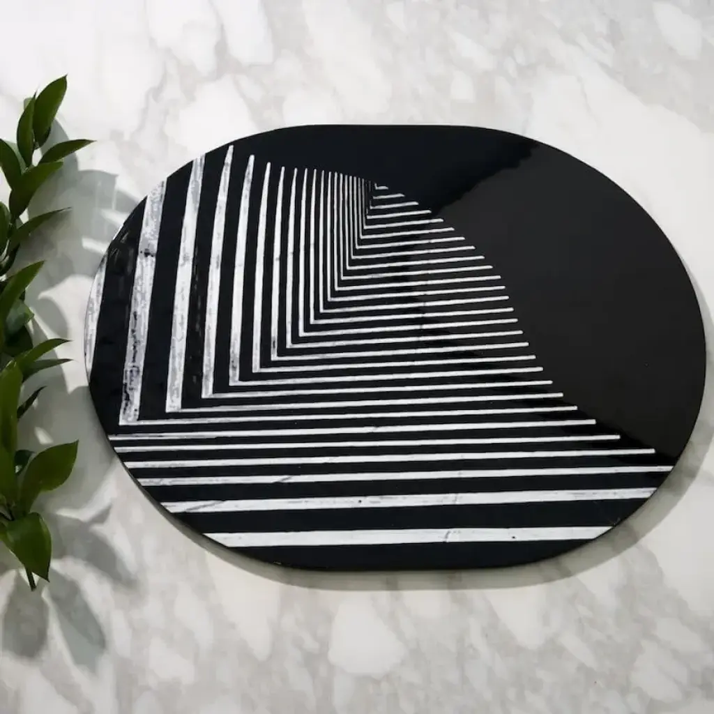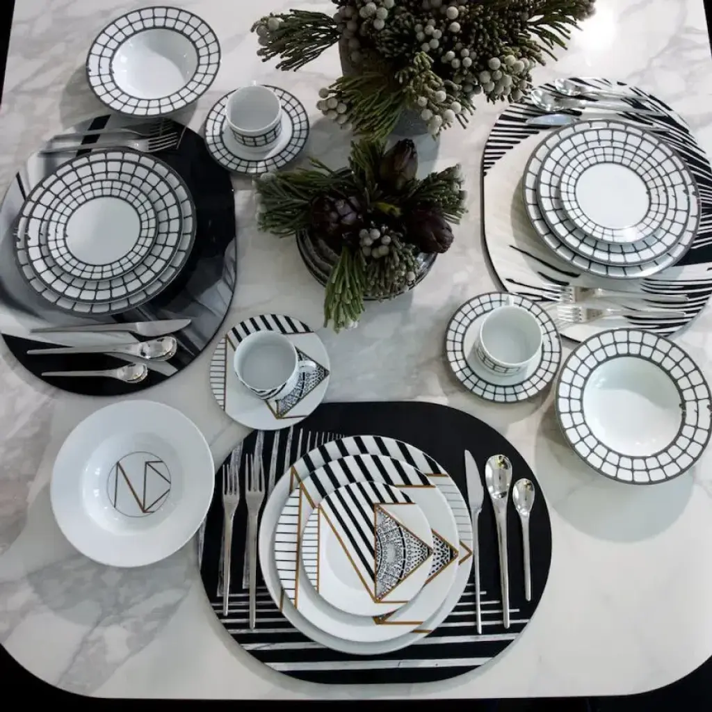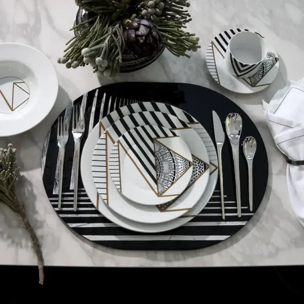 A Nina Magon X Von Gern Home collaboration results in extraordinarily unique placemats that will make your table setting truly stand out. High gloss lacquer accentuates the striking bold design, creating a sleek and modern look reflective of an exhibit showcased at an art gallery. The geometric motif in classic black and white adds contemporary sophistication that can complement any home decor.