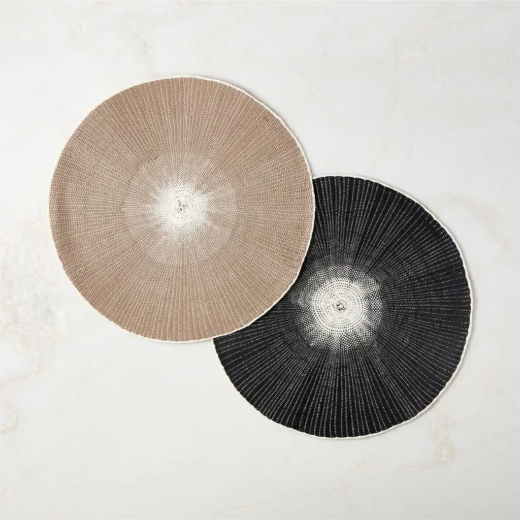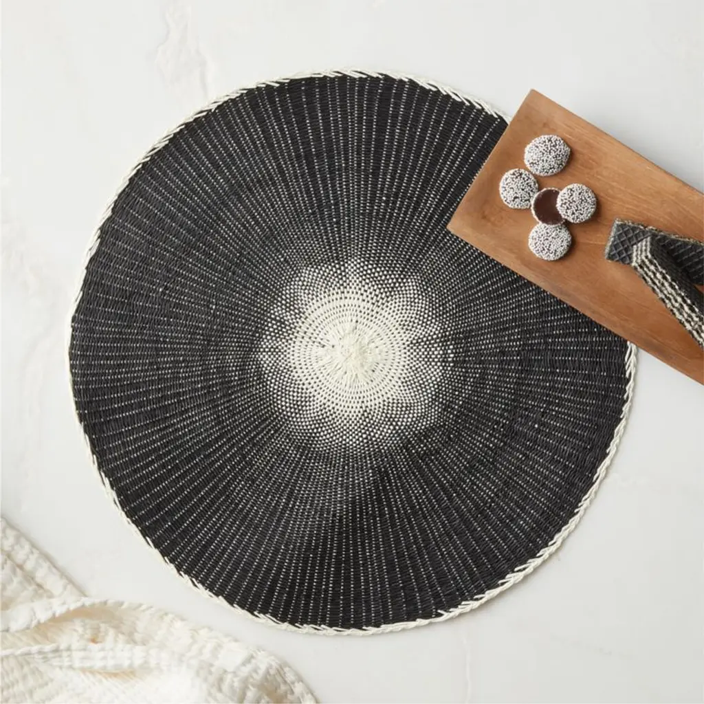 Ivory and black paper is woven to create this round placemat. Modern and graphic, the ivory center fades to black with an ivory border around the edge. CB2 exclusive.