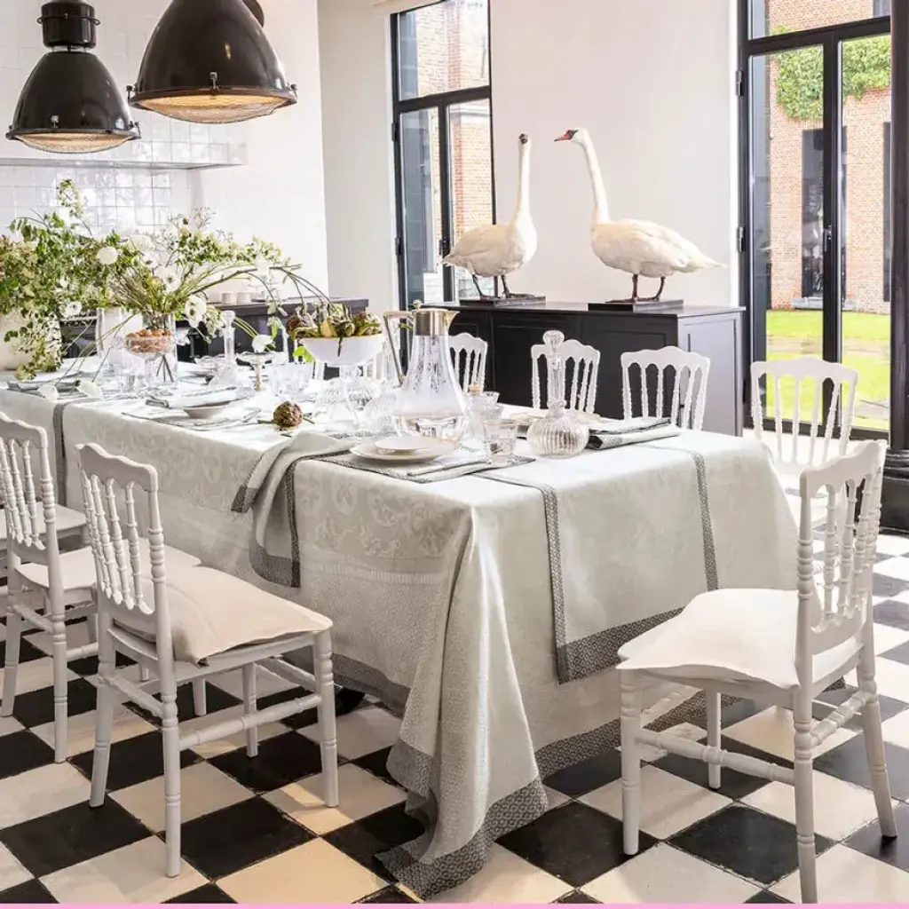 Like a fresco, delicate angels and celestial vaults adorned with Baroque volutes merge subtly, offering a harmonious marriage of elegance and architecture. Since 1888, Le Jacquard Francais has created a collection of table linens without equal. Weavers, warp beamers, knotters and other specialists work in harmony to perfect the weaves and colors of all of their linens. Classic Le Jacquard Francais linens are characterized by using framed woven patterns to create timeless tablecloths, napkins, placemats and table runners that will beautify your tables for many years. Le Jacquard Francais coated tablecloths are made of 100% cotton weave with long fibers. They are waterproof and stain-resistant thanks to a patented and exclusive acrylic coating that withstands washing. Newly introduced, LJF by Le Jacquard Francais is a more casual line of contemporary looks that mixes colors and patterns and plays with graphics. Practical and easy to use, these tablecloths will stand up to frequent use in the kitchen or patio.