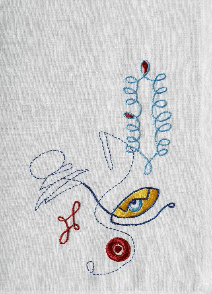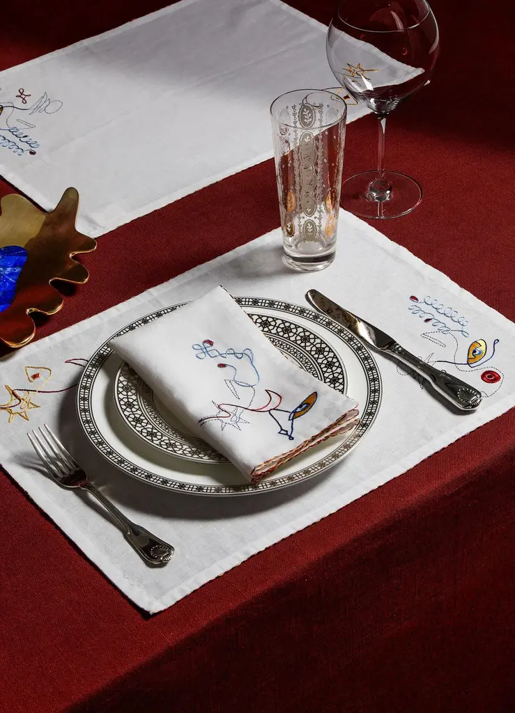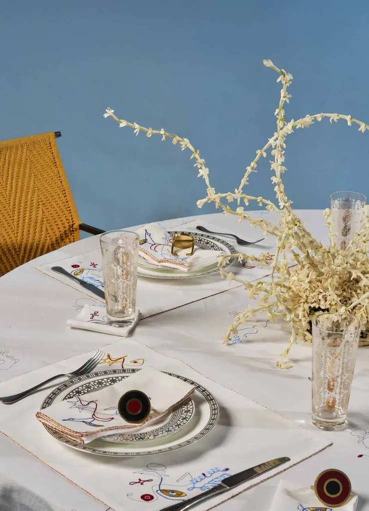 Evil Eye White Placemat - Set of 2 in Cotton Linen, Viya by Vikram GoyalThe collection reimagines a protective totem for your home in the form of hand-embroidered table linen– negative energy knows it is not welcome here. From Kashmir to Kanyakumari, the “Nazar” motif has cast a watchful eye against evil forces for centuries. This talismanic belief transforms into more abstract forms across the textiles- from hanging lemon and chilli, a spirited face, or as an eye itself. Bring it home and watch it stand guard.Placemat in cotton linen. Handmade in India.Product DetailsMaterial: Cotton LinenSize: 14"W x 19"L 35.6 W x 48.3 L cmWeight: 0.06 0.132 lbsNumber of Pieces: 2 PlacematsSKU: VTP601This product has been handcrafted by local artisans. As such, slight variations are a testament to the unique character of a piece made by hand.