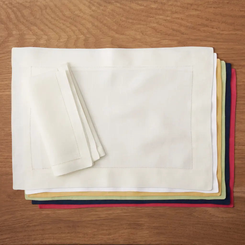 Beautiful placemats in bold solid colors, with a row of hemstitching detail for an elegant dining table.