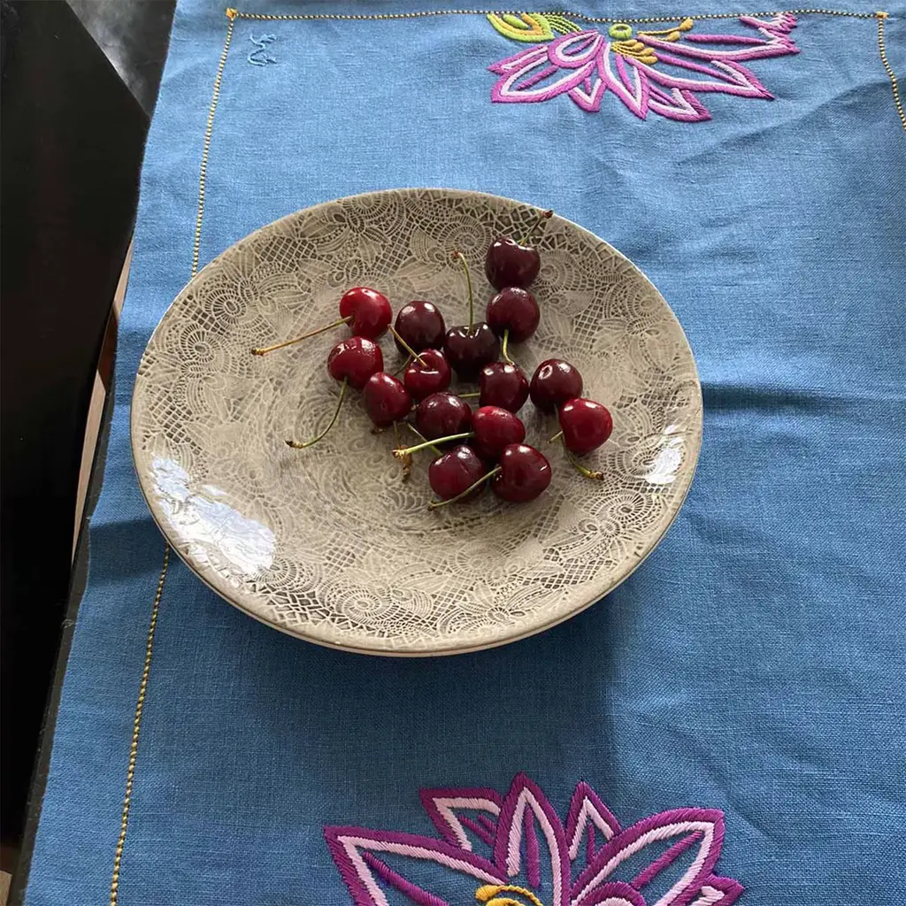 With the central motif on display, these colourful hand-embroidered placemats create a sophisticated and uniform table-scape, the perfect individual backdrop to any meal. With each motif taking fourteen hours to complete, and each meter of open hem two hours to prepare, the artistry behind each design is significant. Pair with contrasting coloured crockery for a bolder design statement.Through intricate detailing and unexpected colour combinations, the organic beauty of its floral motifs stands out, creating exquisite moments across the surface. Connecting us back to the wonder of nature itself, this collection adds charm and style to every table setting on which it is placed.