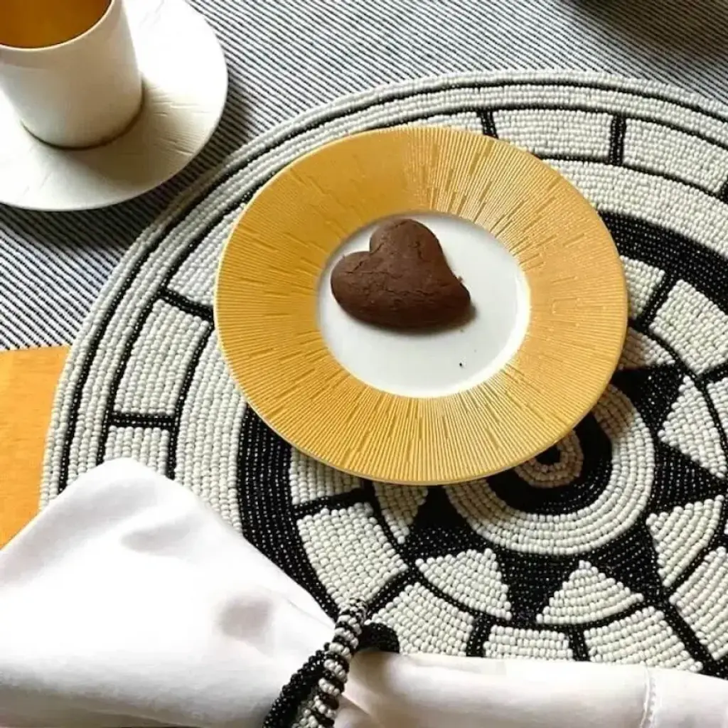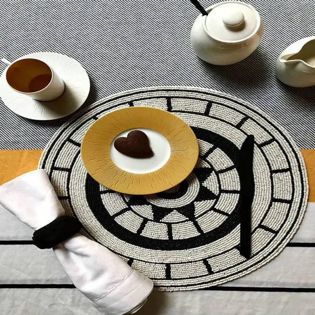 Elevate the everyday with exotic elements that transport and enliven. Inspired by the geometric designs of the Byzantine tilework and architecture of Istanbul, these beaded placemats allow you to experience the romance of travel at your table. Cotton backing protects both the exceptional beadwork and table surface.