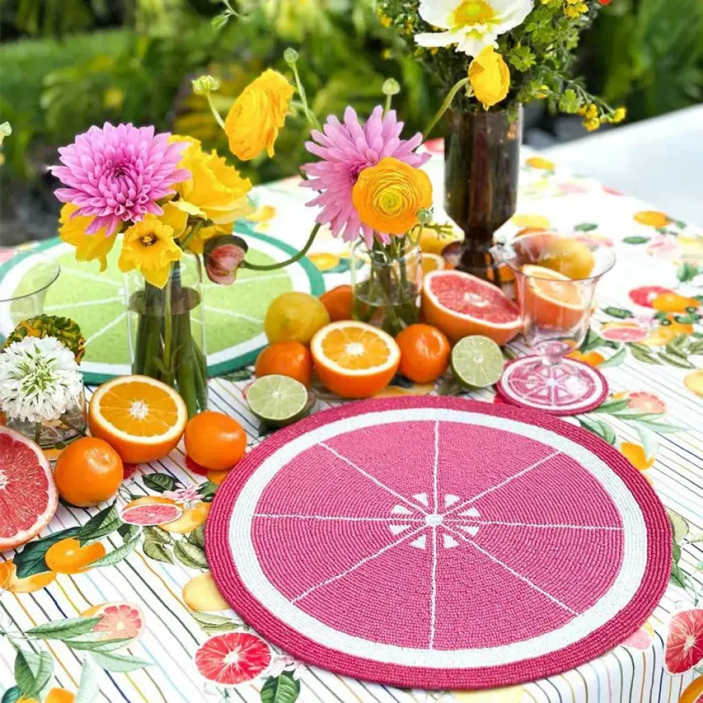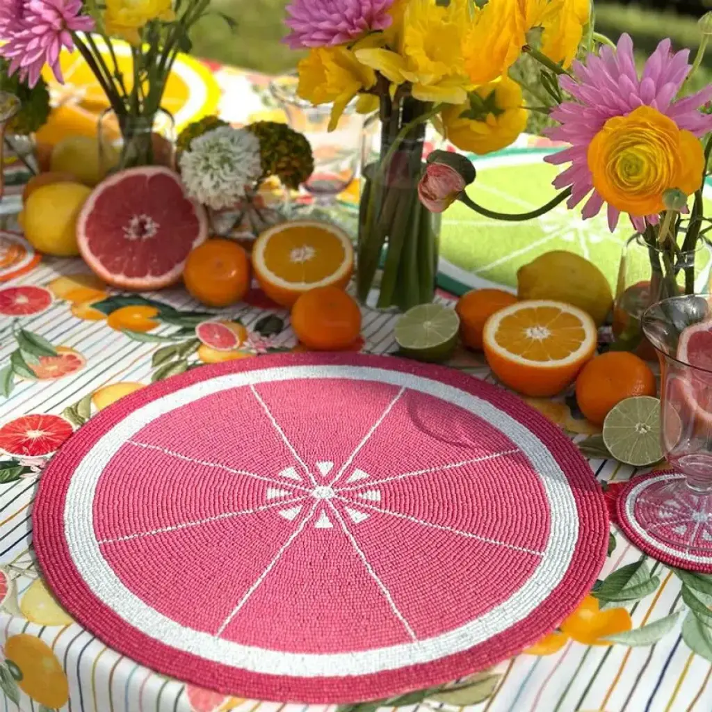 Sweet and zesty, these citrus-inspired placemats will brighten up your table with a fresh fun vibrancy. The Grapefruit Placemats add striking and vivacious reddish pink hues to your tablescape, creating a festive yet undeniably modern and chic look. These hand-beaded placemats are sure to delight your guests.