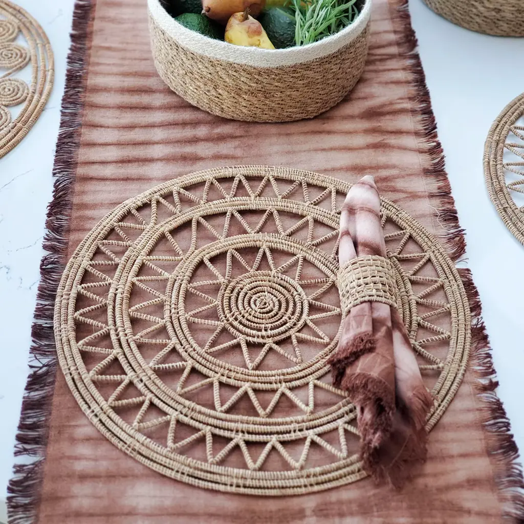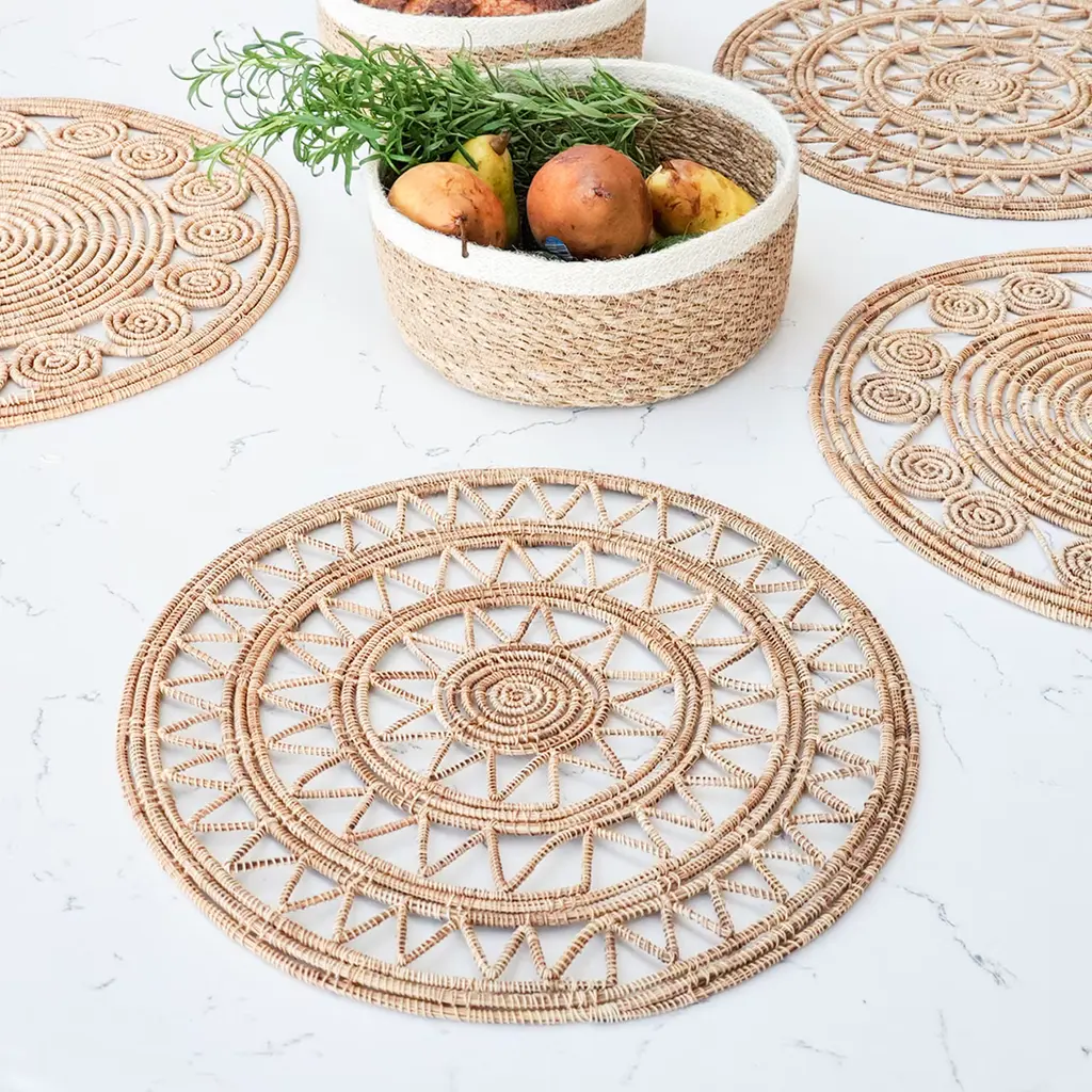 Elevate your dining experience with our handwoven natural palm fiber placemat. Discover the beauty of artisanal craftsmanship and unique textures in each piece. These placemats bring rustic charm and warmth to your table setting, enriching your home decor with natural fiber elegance.Each product is designed and curated by KORISSA, sustainably handmade by Fair Trade artisans in Bangladesh.
