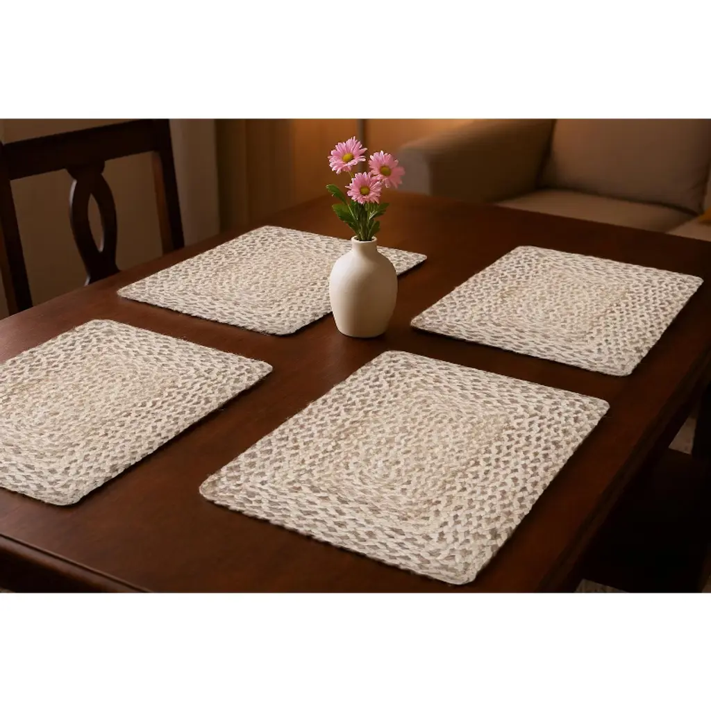 19-inch set of four ivory and natural jute placemats offers a charming way to enhance your dining experience. Each placemat is handmade, showcasing unique craftsmanship and attention to detail. The rectangular shape provides ample space for your dinnerware, adding a sophisticated touch to your table setting. Crafted from durable jute, these placemats are both eco-friendly and stylish, perfectly blending traditional aesthetics with natural colors. The set includes four pieces, allowing you to easily accommodate family and guests during meals. Ideal for both casual and formal occasions, these placemats elevate the look of any dining area while providing a protective layer for your tabletop. They are a delightful addition to your home decor. 13-inch h x 19-inch w x 0.3-inch d.