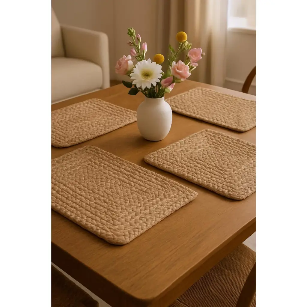 19-inch set of four natural jute placemats adds a rustic charm to your dining experience. Each placemat is handmade from durable jute, ensuring quality and uniqueness in every piece. The rectangular shape fits perfectly on any table, providing a stylish backdrop for your dinnerware. This traditional design complements a variety of home decor styles, making it a versatile choice for any occasion. The natural color enhances the organic feel, seamlessly blending with other elements in your dining space. This set includes four placemats, making it ideal for family gatherings or elegant dinner parties. Elevate your dining table with this beautiful set that combines functionality and aesthetics without compromising on style. 13-inch h x 19-inch w x 0.3-inch d.