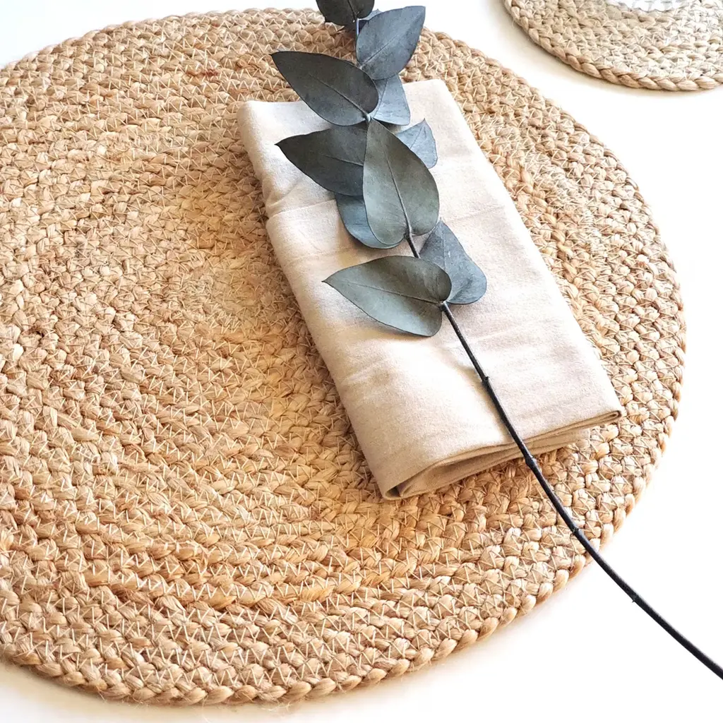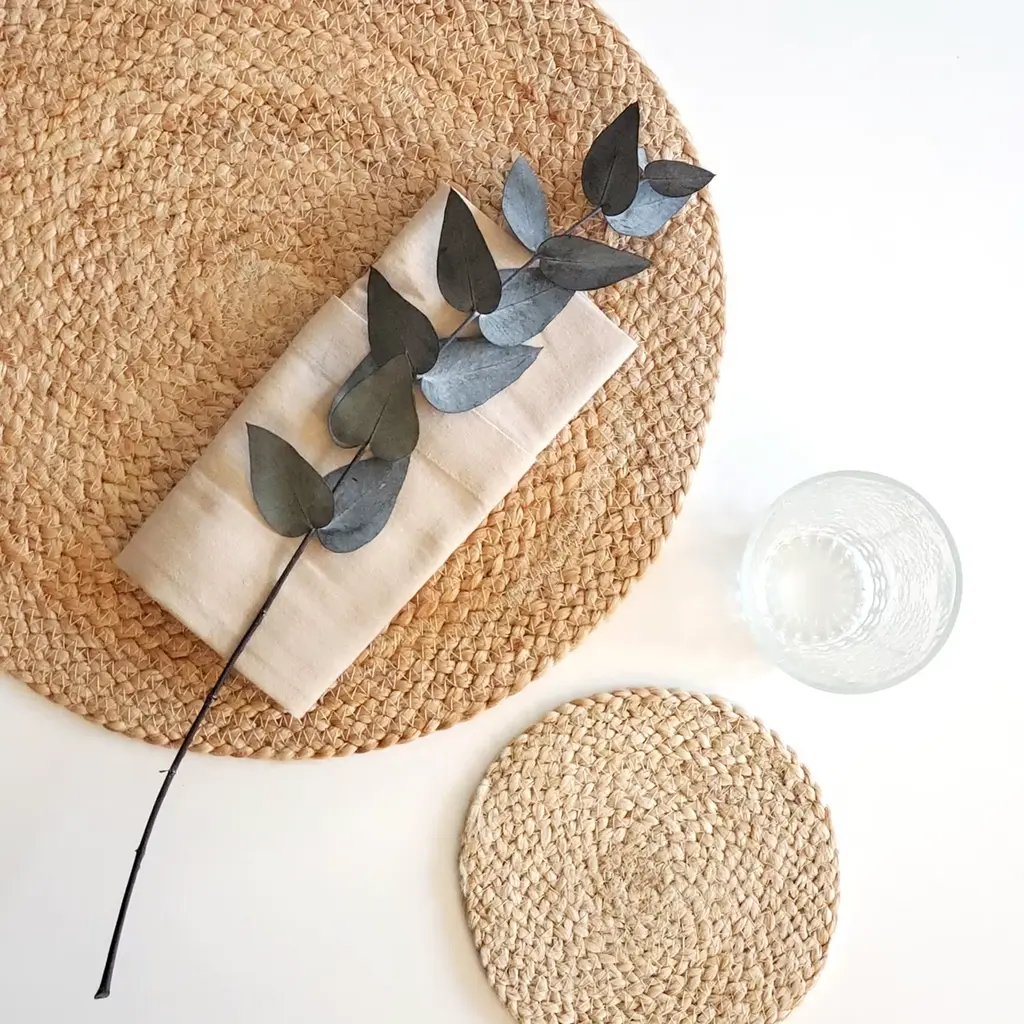 Add natural textures and neutral color to your kitchen or dining table with these natural jute placemats. These handwoven placemats protect your tabletop and the simplicity of natural color will easily coordinate with any color scheme and provide a perfect finish to your table setting.Each product is designed and curated by Korissa, sustainably handmade by Fair Trade artisans in Bangladesh.