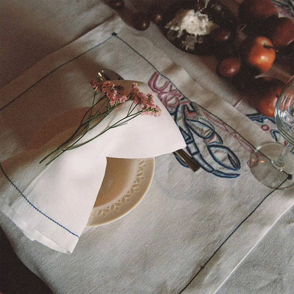 With the central motif on display, these colourful hand-embroidered placemats create a sophisticated and uniform table-scape, the perfect individual backdrop to any meal. With each motif taking fourteen hours to complete, and each meter of open hem two hours to prepare, the artistry behind each design is significant. Pair with contrasting coloured crockery for a bolder design statement.Native to the country’s coastal areas, Lobsters are the symbol of this collection, depicted using a variety of colour combinations across the four shades presented. Using embroidered lines, the motifs draw us back to the vivid and eye-catching beauty of the creature itself.