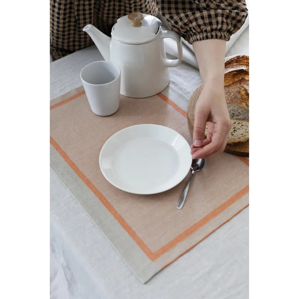 The Laina placemat from Lapuan Kankurit is decorated with a simple orange box that underlines each diner's space at the table. Designed by Elina Helenius, the placemat embodies the understated beauty of traditional linen weaving, yet with an added decidedly modern touch. The Laina placemat has been woven from 100% linen in the town of Lapua, Finland. Did you know that the brand name Lapuan Kankurit literally translates to "weavers of Lapua"?