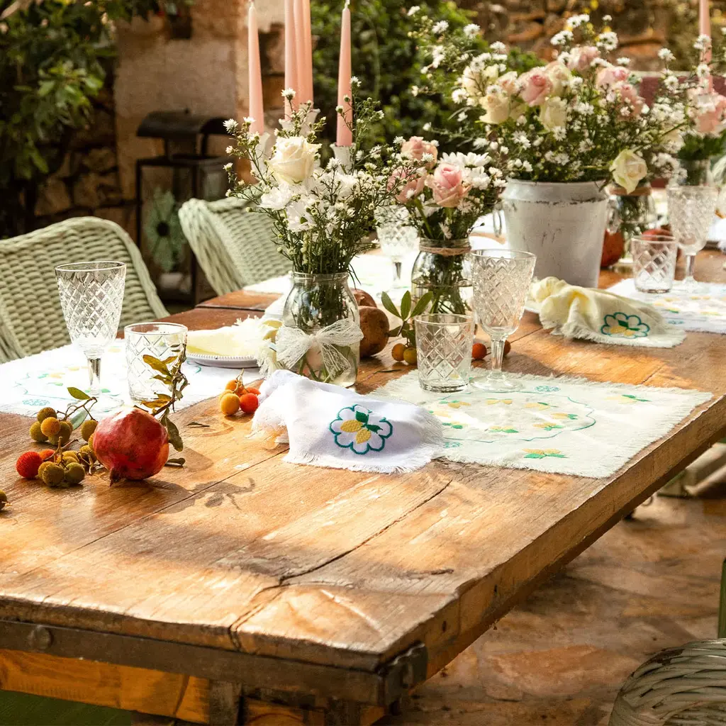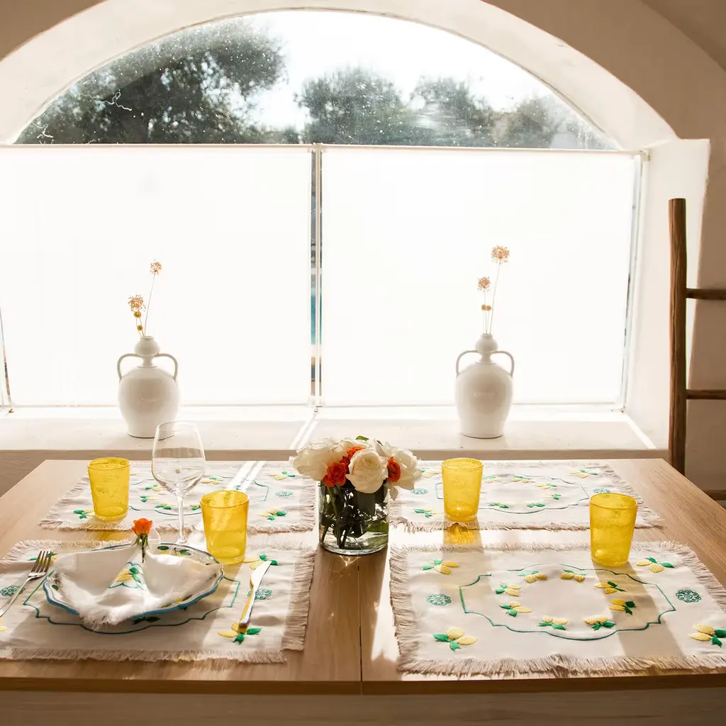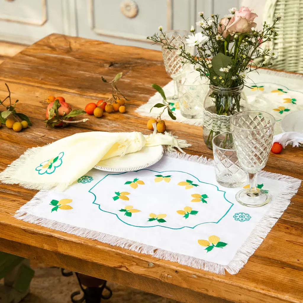 This stunning set of two table mats allows for having breakfast while dreaming of a fragrant lemon grove. Crafted of Masters of Linen-certified white linen, it flaunts exquisite and unique manual embroideries, mainly of lemons, in fine Mako cotton that appear as framed by the elegant fringes enlivening the table mat's profile. More color options are available in the Artemest catalog.