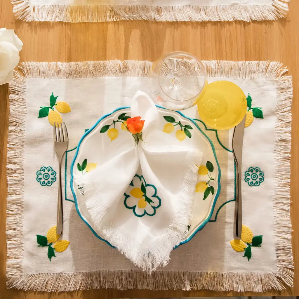 Limoni Set Of 2 Embroidered Fringed White Table Mats