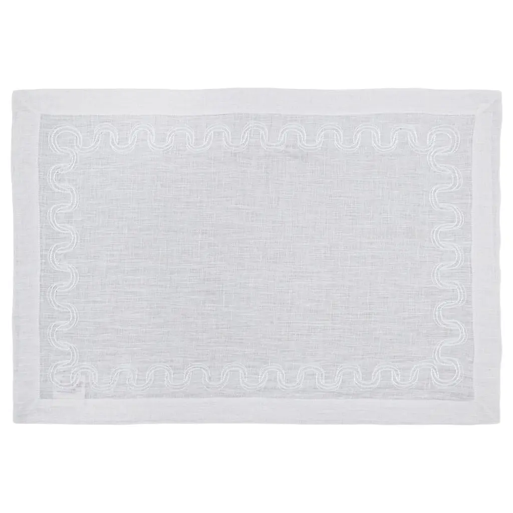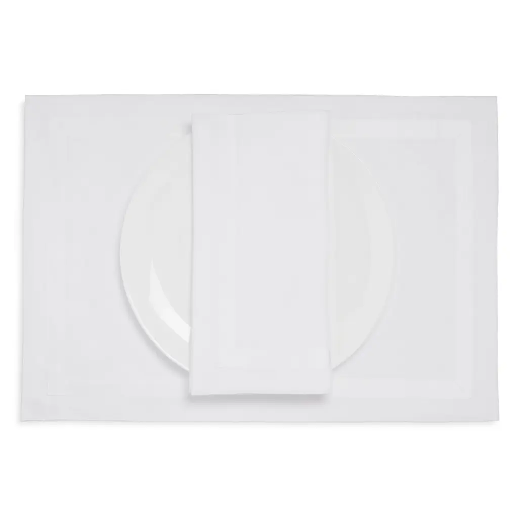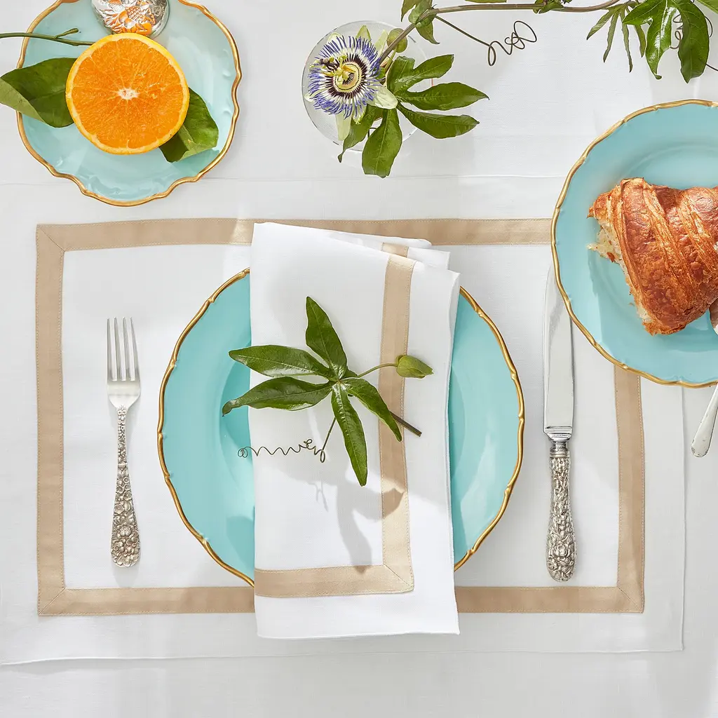 A classic sateen border adorns the tablecloth, placemat and napkins of Matouk's iconic and best-selling Lowell linen collection.