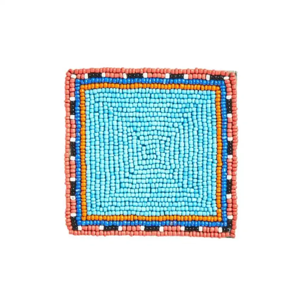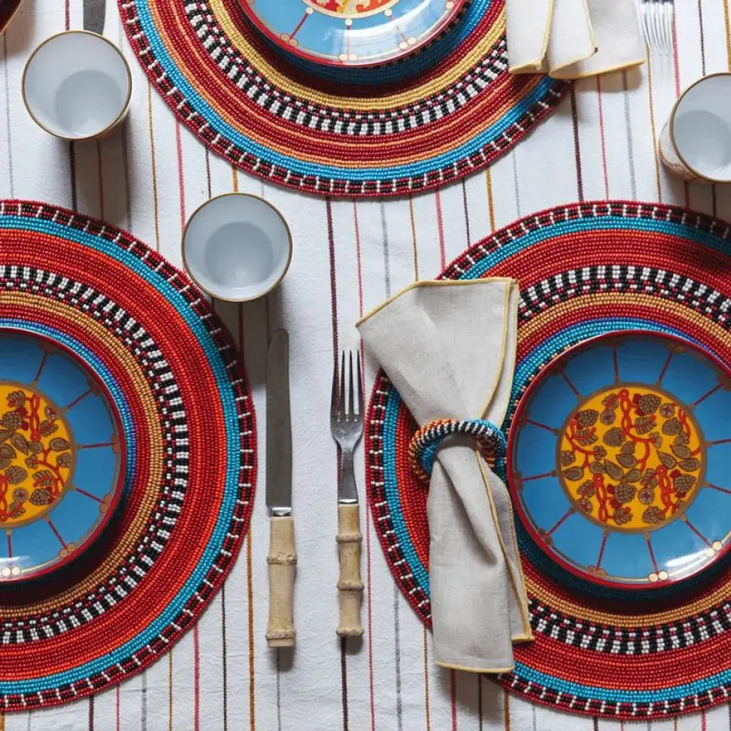 Elevate the everyday with exotic elements that transport and enliven. Inspired by the vibrant color combinations and intricate patterns of jewelry crafted by the Maasai Tribe in Africa, these beaded placemats are like colorful jewelry for the table. Cotton backing protects both the exceptional beadwork and table surface.