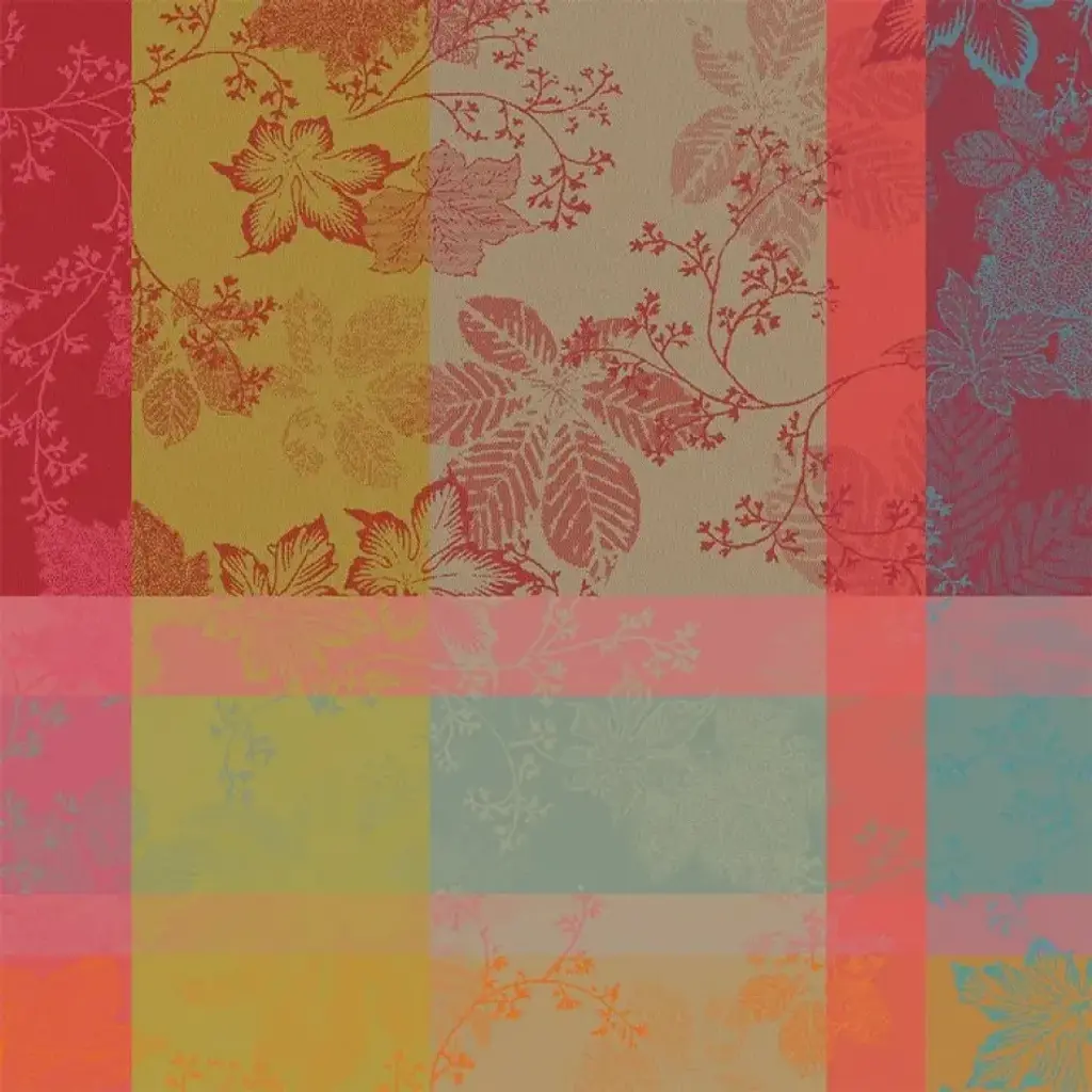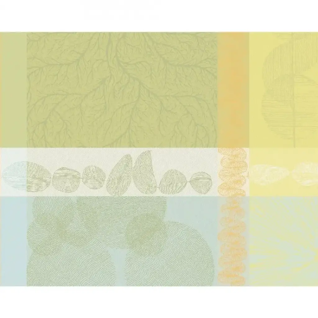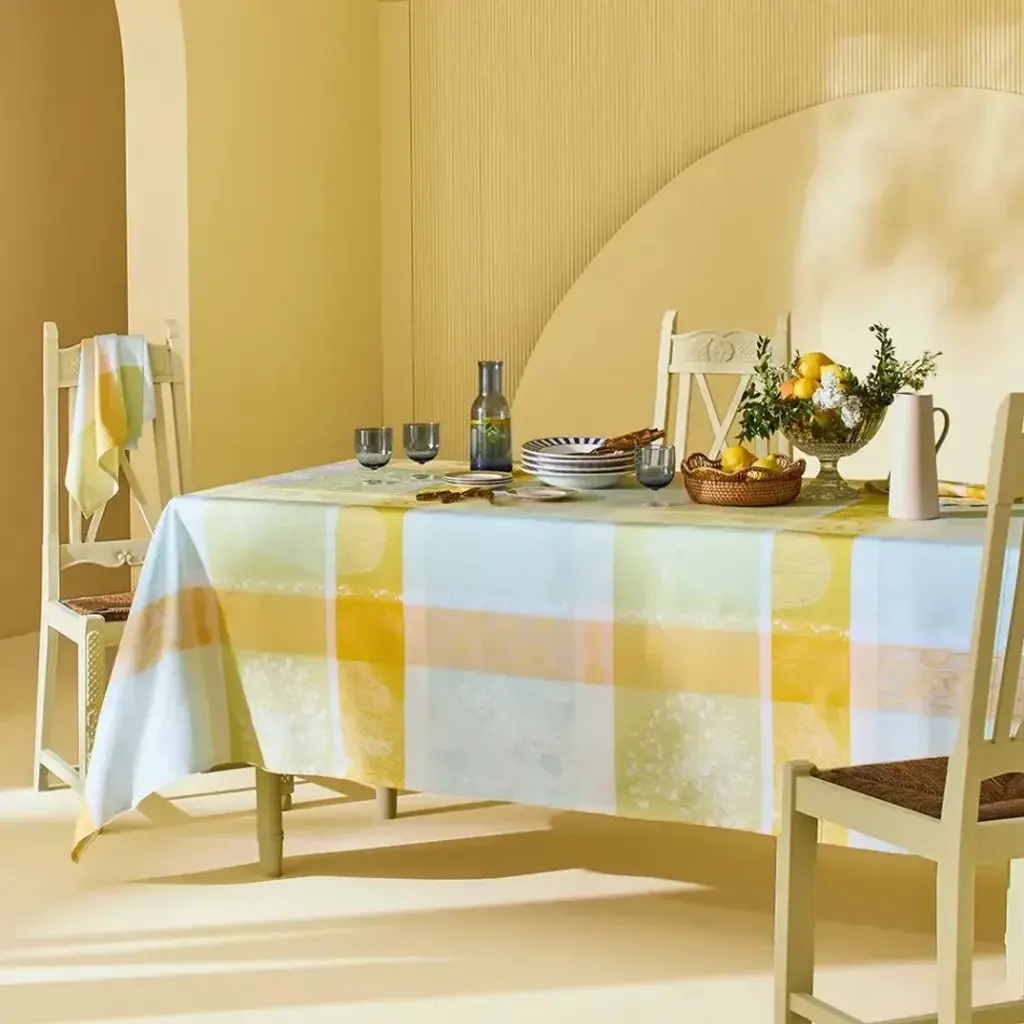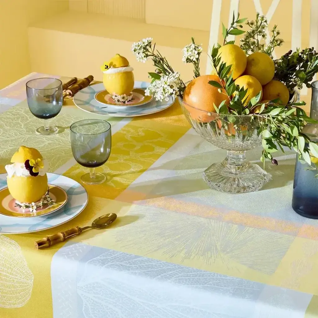 The Mille Lieues Aube Coated Cotton Tablecloth by Garnier Thiebaut combines vibrant elements of the dawn, soundwaves, roots, and dandelions in yellow, orange, blue, and white with a practical, stain-resistant coating. Woven using jacquard looms with extra-long staple cotton, it's as easy to maintain as it is beautiful. One swipe of a sponge removes any possible stains. Since 1870, Garnier-Thiebaut has created classic and jacquard linens in the quintessential French style. Their linens have been used by the Four Seasons George V in Paris, the Mandarin Oriental Hotel in Geneva, The Ritz Carlton, Manama (Bahrain), Le Meridien Bora Bora, the Four Seasons Hotel, New York, and The French Laundry in Yountville.
