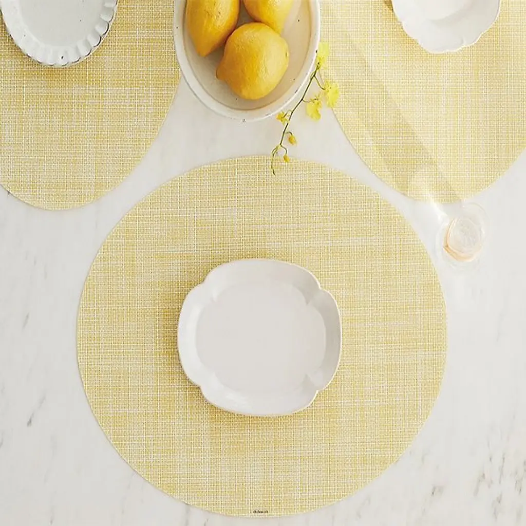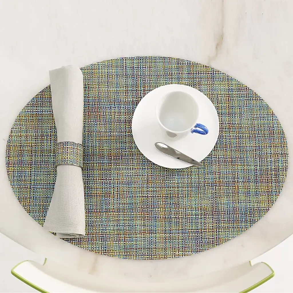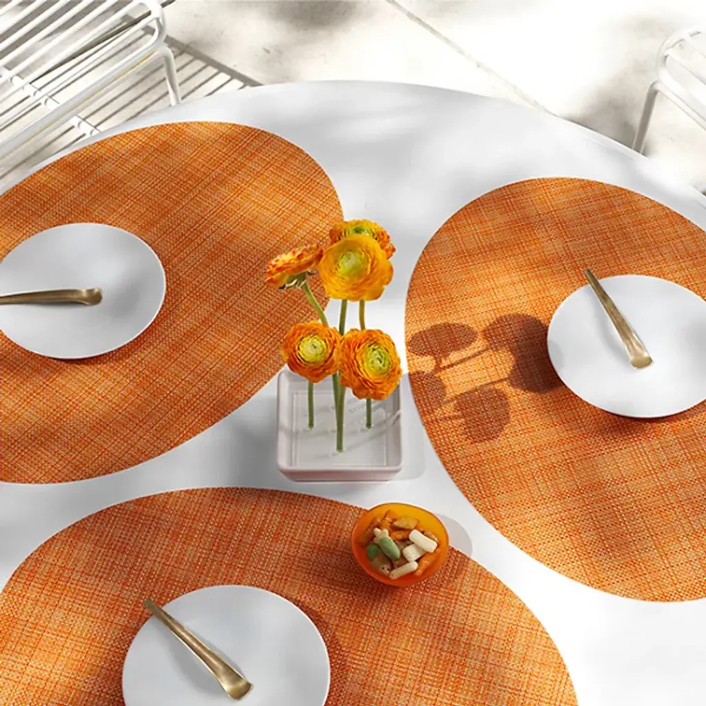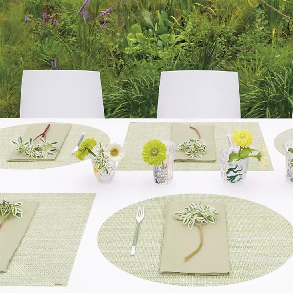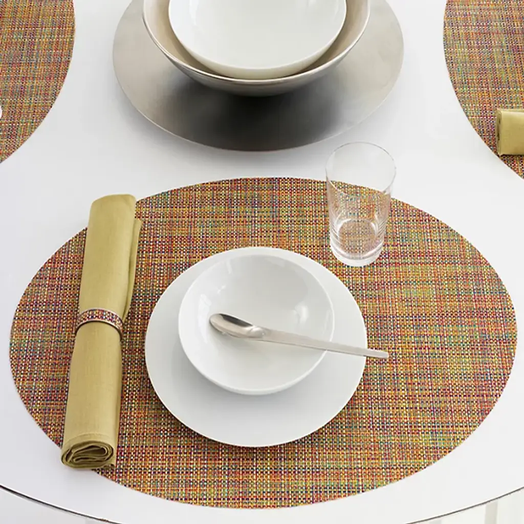 The classic Chilewich mini basketweave is now available in a new oval shape. The Chilewich Mini Basketweave Oval Placemat softens the distinctive, formal weave with subtly rounded edges. The soft shape makes the set particularly well-suited for arrangement around an oval dining table. Made out of woven vinyl, available in numerous colors.