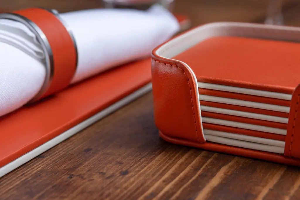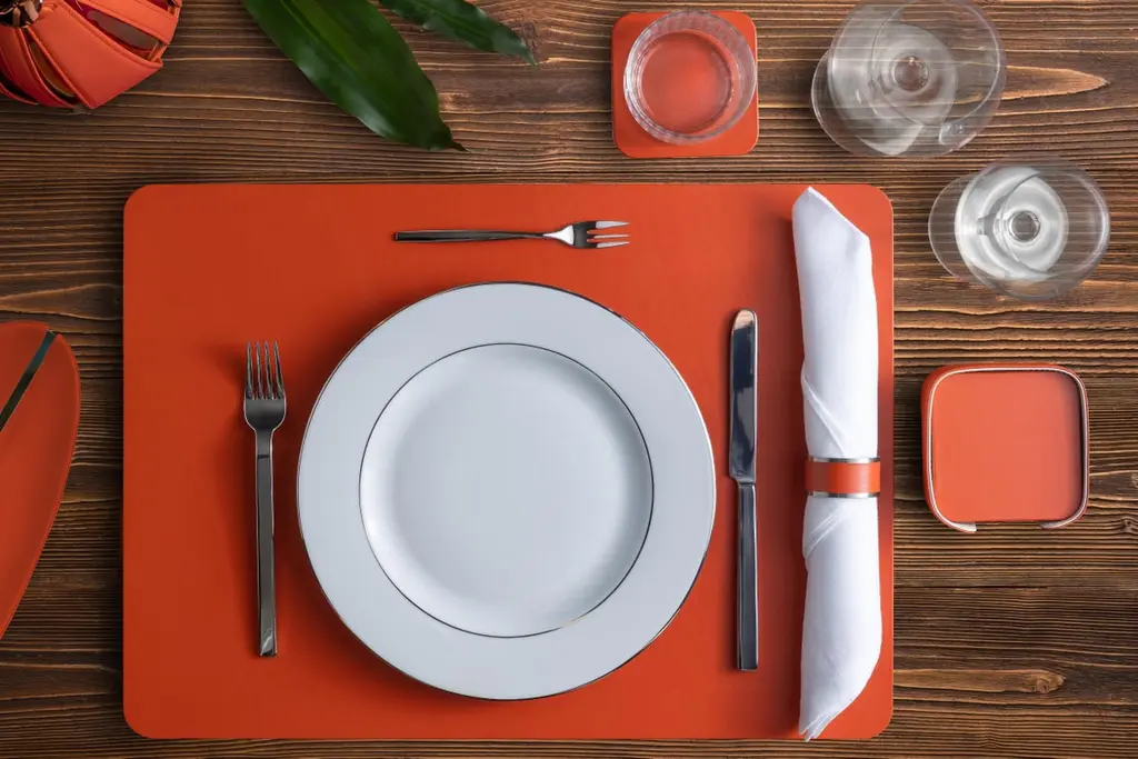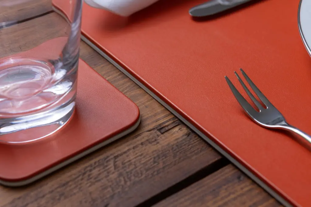 The Mondrian placemat is made of high-quality Foglizzo leather to give your dining environment an elegant sense of style and luxury. Its sleek shape precisely frames tableware, providing enough space for dinner plates or serving dishes, instantly adding a modern touch to any dining setting. Its design is influenced by the abstract art of Piet Mondrian, with geometric lines and bold, vibrant colors.Elegant and simple, it matches perfectly with the coordinating coasters and napkin rings and is available in rectangular, oval, capsule and round versions.