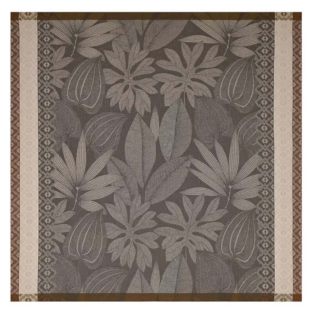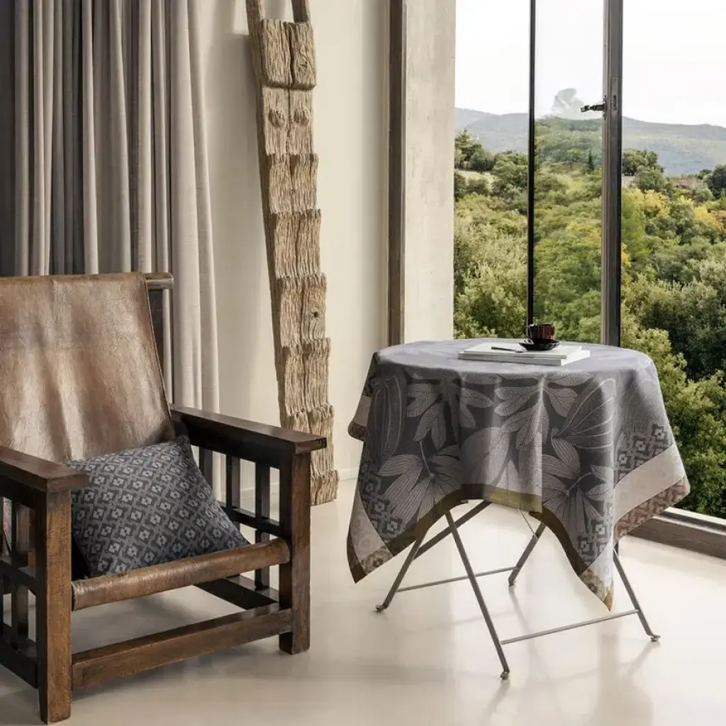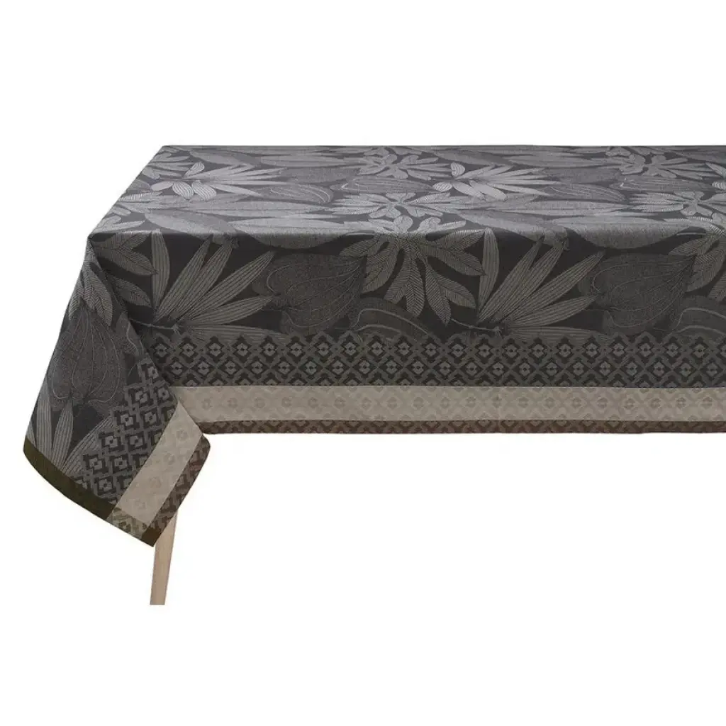 Nature Sauvage answers our quest for the essential and for nature. A generous and abundant flora accompanied by a geometric tribal pattern creates a warm atmosphere. The Jacquard weaving reveals the refinement of the patterns for a collection combining power and elegance. Animals are revealed on small pieces and accessories for a more casual atmosphere. A tablecloth with a plant all-over worked with a fine weave that reveals in the slightest detail the beauty of different foliage. In tone on tone, it will allow you to use contemporary as well as more classic tableware. Since 1888, Le Jacquard Francais has created a collection of table linens without equal. Weavers, warp beamers, knotters and other specialists work in harmony to perfect the weaves and colors of all of their linens. Classic Le Jacquard Francais linens are characterized by using framed woven patterns to create timeless tablecloths, napkins, placemats and table runners that will beautify your tables for many years. Le Jacquard Francais coated tablecloths are made of 100% cotton weave with long fibers. They are waterproof and stain-resistant thanks to a patented and exclusive acrylic coating that withstands washing. Newly introduced, LJF by Le Jacquard Francais is a more casual line of contemporary looks that mixes colors and patterns and plays with graphics. Practical and easy to use, these tablecloths will stand up to frequent use in the kitchen or patio.