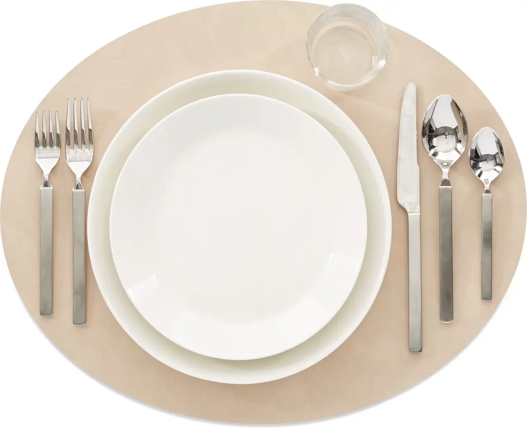 Nupo Leather Placemats (2014) have a soft structure and suede-like surface thanks to a combination of recycled leather and natural rubber. Clean with a damp cloth. Made in Denmark.