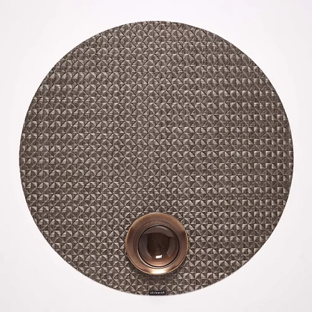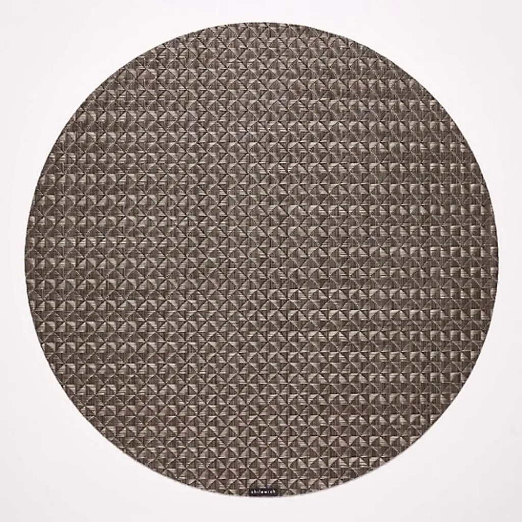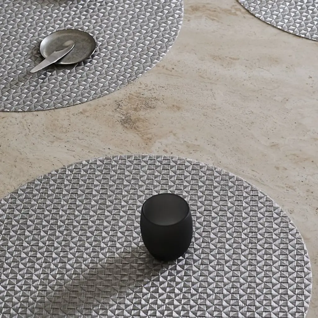 A standout feature of geometry inspired by the art of Origami and the contrasting surfaces of a collage. The Origami Round Placemat from Chilewich protects your surface with great style and pizzazz. It's a piece brought to mind after designer Sandy Chilewich's play with the collage art process. The collage's elegant geometry and bold contrast are infused into the terra strand vinyl weave. A movement of triangles follows to the edges of a clean circular outline, each one moving with a vertical or horizontal movement. While deep with origami-facets, this piece cleans up with ease.