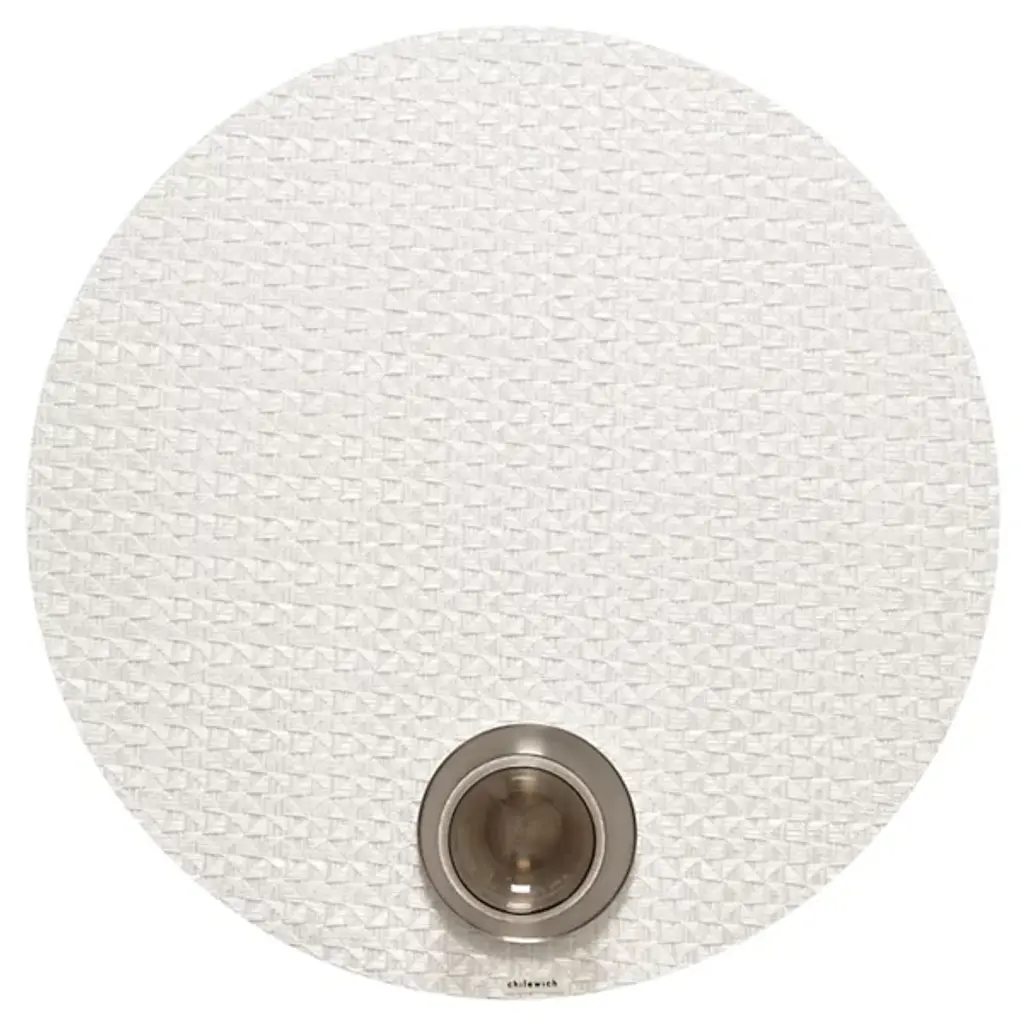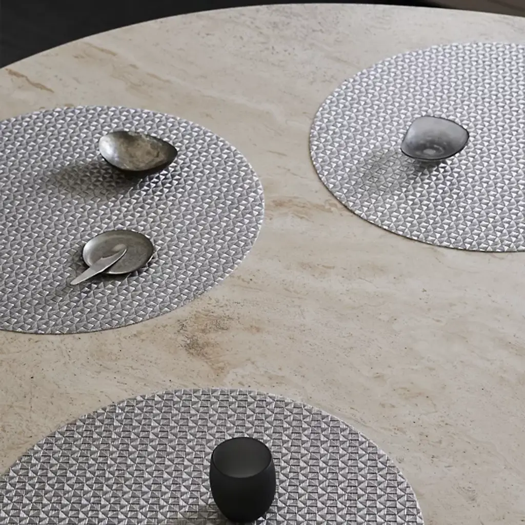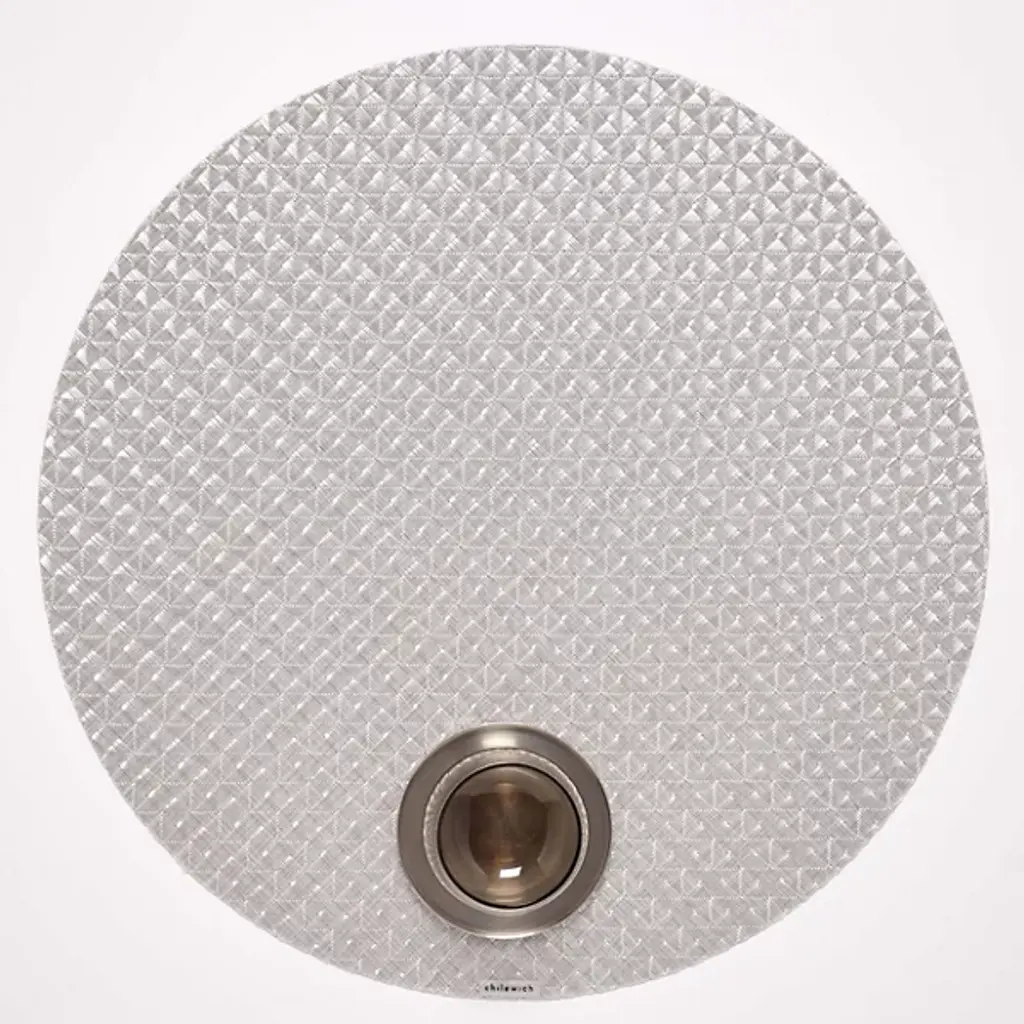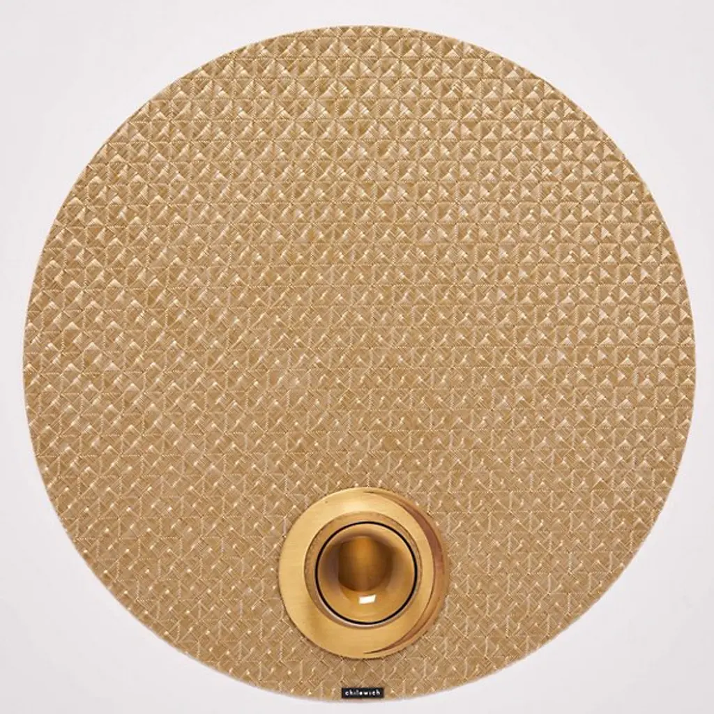 A standout feature of geometry inspired by the art of Origami and the contrasting surfaces of a collage. The Origami Round Placemat from Chilewich protects your surface with great style and pizzazz. It's a piece brought to mind after designer Sandy Chilewich's play with the collage art process. The collage's elegant geometry and bold contrast are infused into the terra strand vinyl weave. A movement of triangles follows to the edges of a clean circular outline, each one moving with a vertical or horizontal movement. While deep with origami-facets, this piece cleans up with ease.