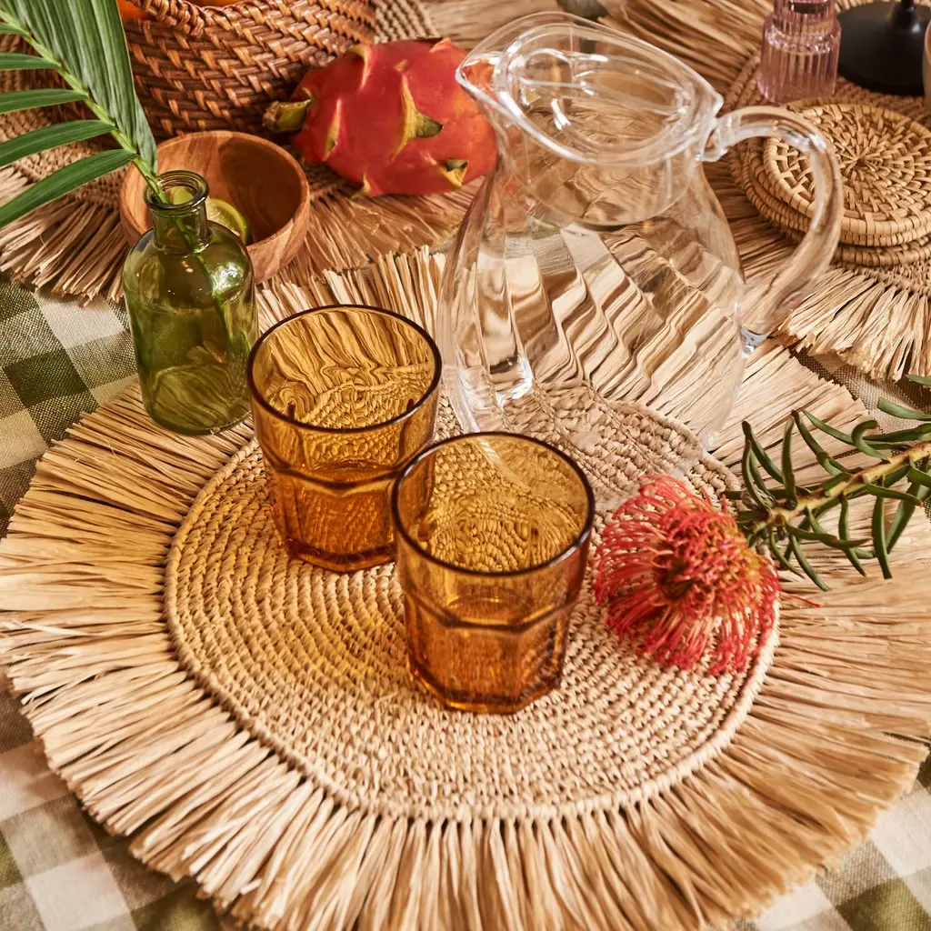 Set apart by a colorful fringe detailing, the Pahiyas Woven Raffia Placemat is a statement piece that is set to enliven a familiar space or add some flair to a dinner party.
